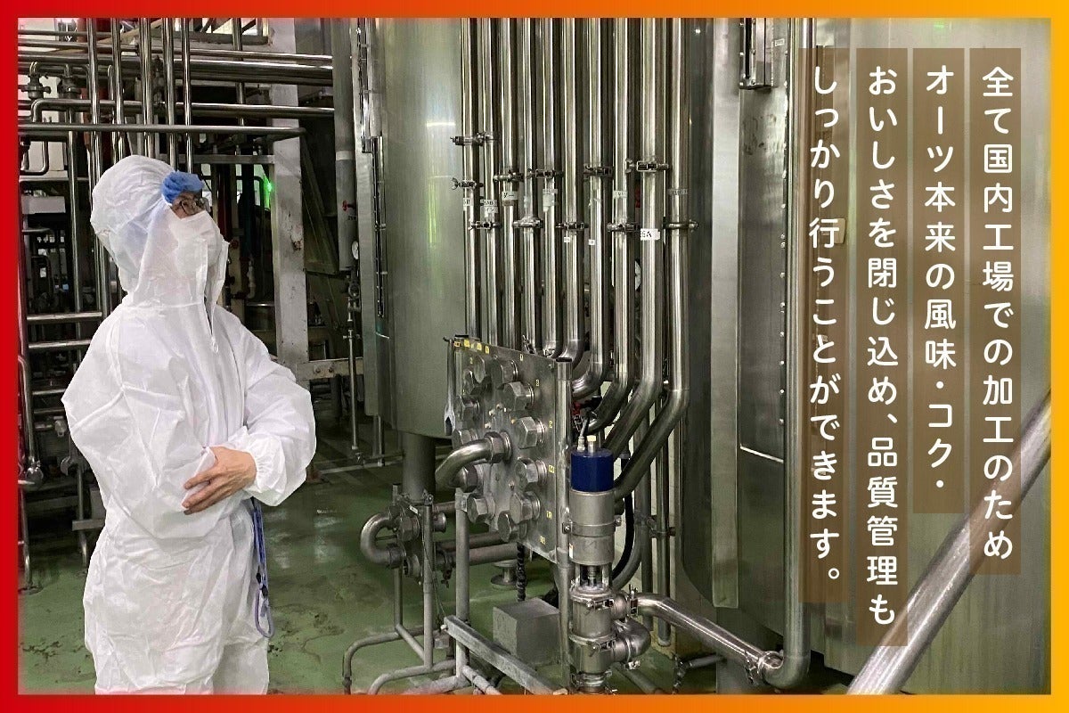 原料を輸入して以降、全ての加工工程を国内の協力工場で手掛けています。国内生産イコール安心安全では決してありません、しかし輸入品の多いオーツミルクだからこそ、国内生産にこだわり、私達自身も協力工場の生産現場に立ち会わせて頂いて、品質と安全性を一緒に確認しています。