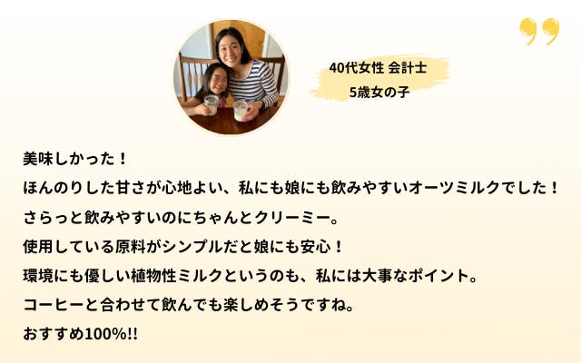 その上で、大人も子供も飲みやすいことを第一に考えてつくったオーツミルクは、特に「おいしさ」「安心安全」「環境」をコンセプトととして製品化しています、ひとつずつ説明させてください。