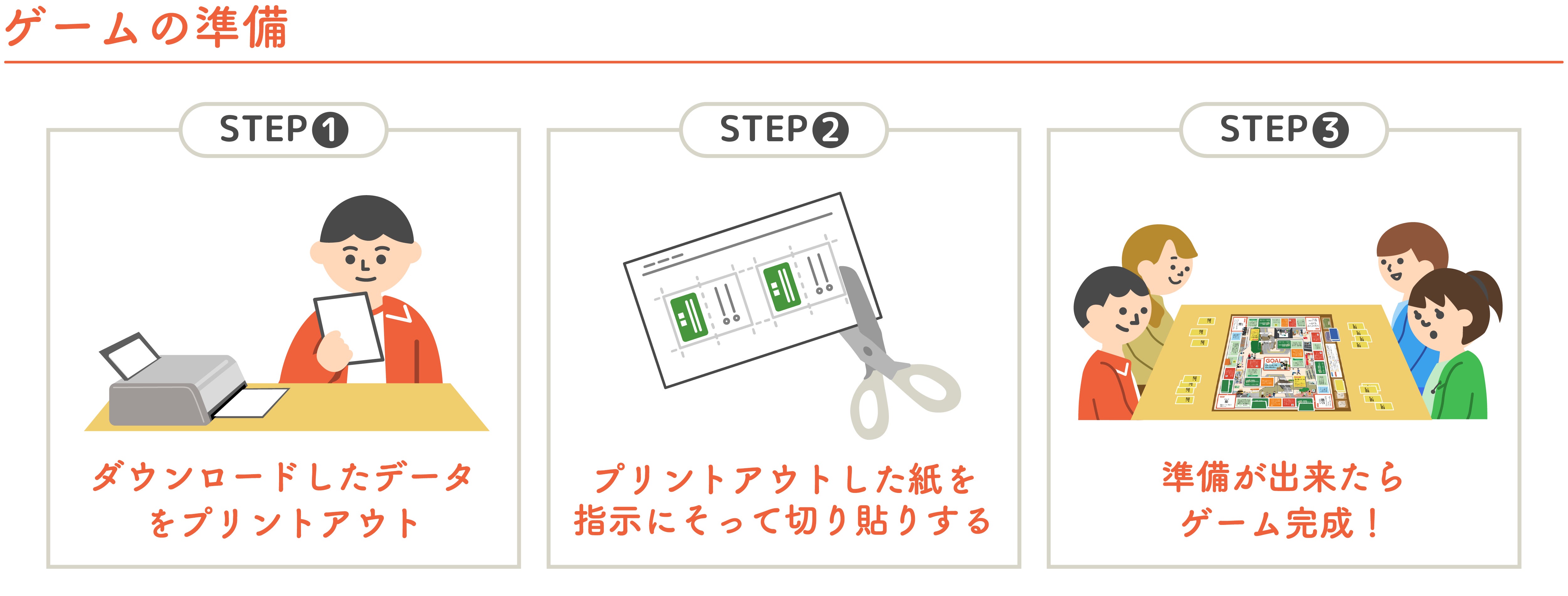 ダウンロードした後は各々の環境でプリントアウトしていただき、ハサミで切ったりノリで貼っていただくだけでプレイしていただけます。