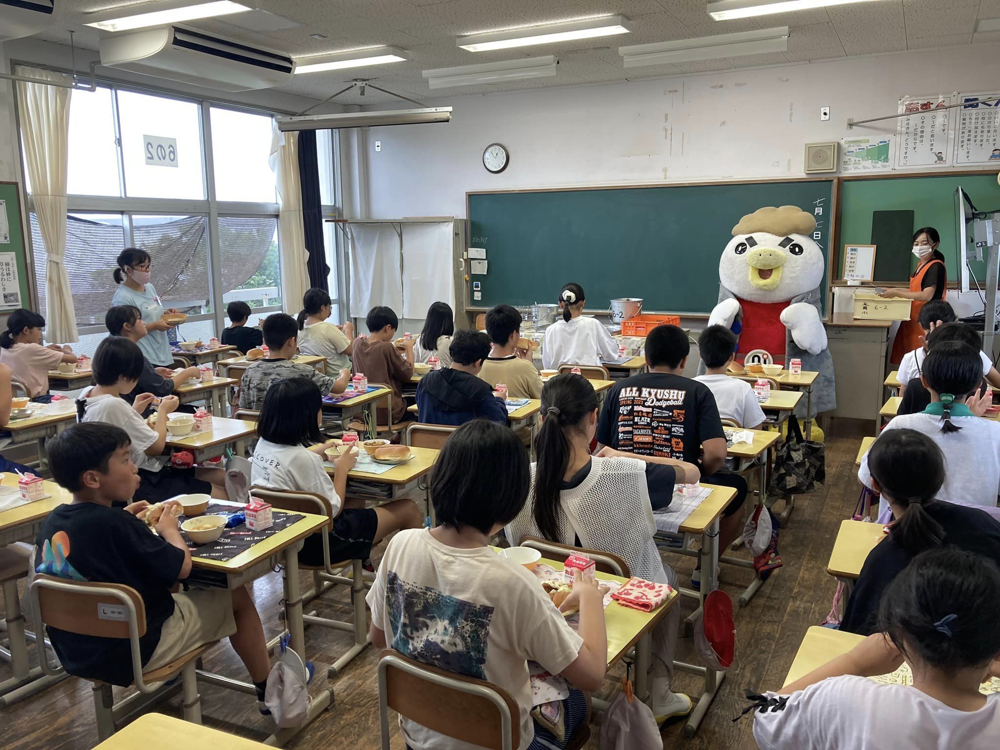 給食の時間にマスコットキャラクターのチキなん番長と、友達ののぼるくんと一緒に教室を訪問させていただきました!