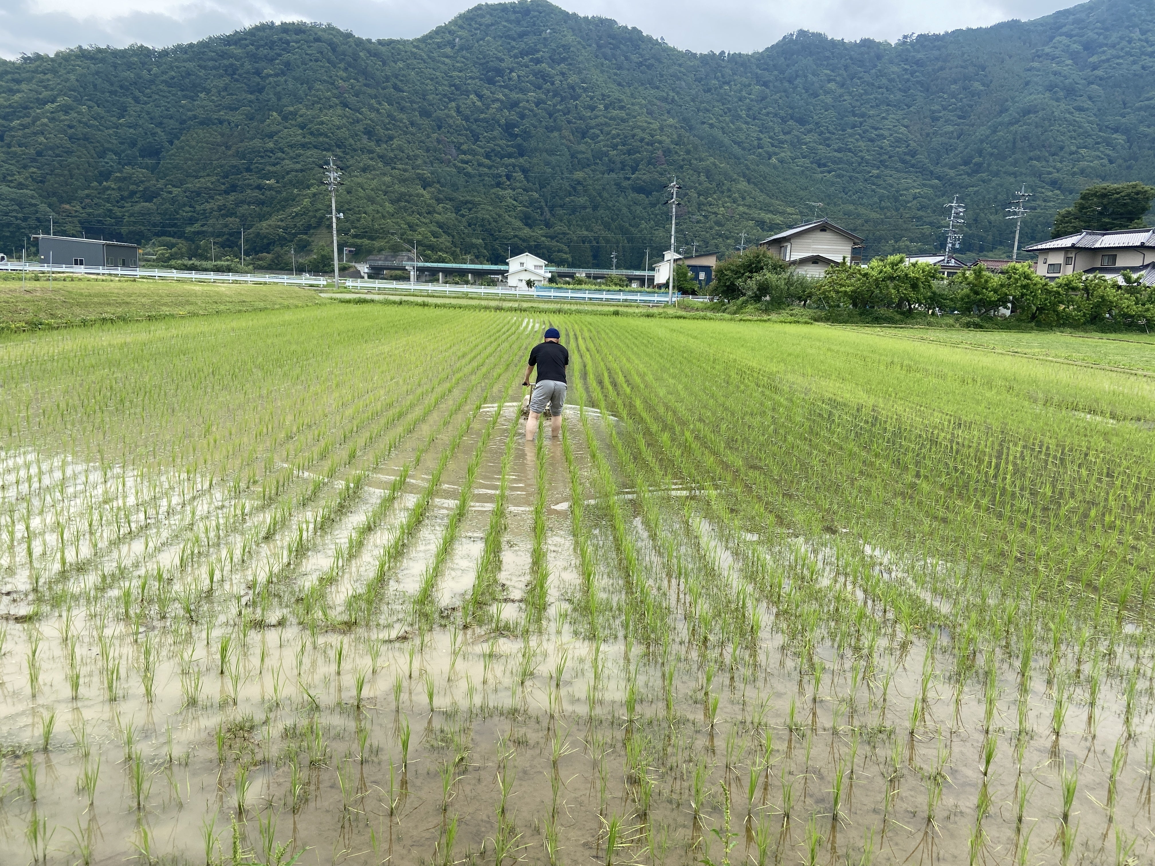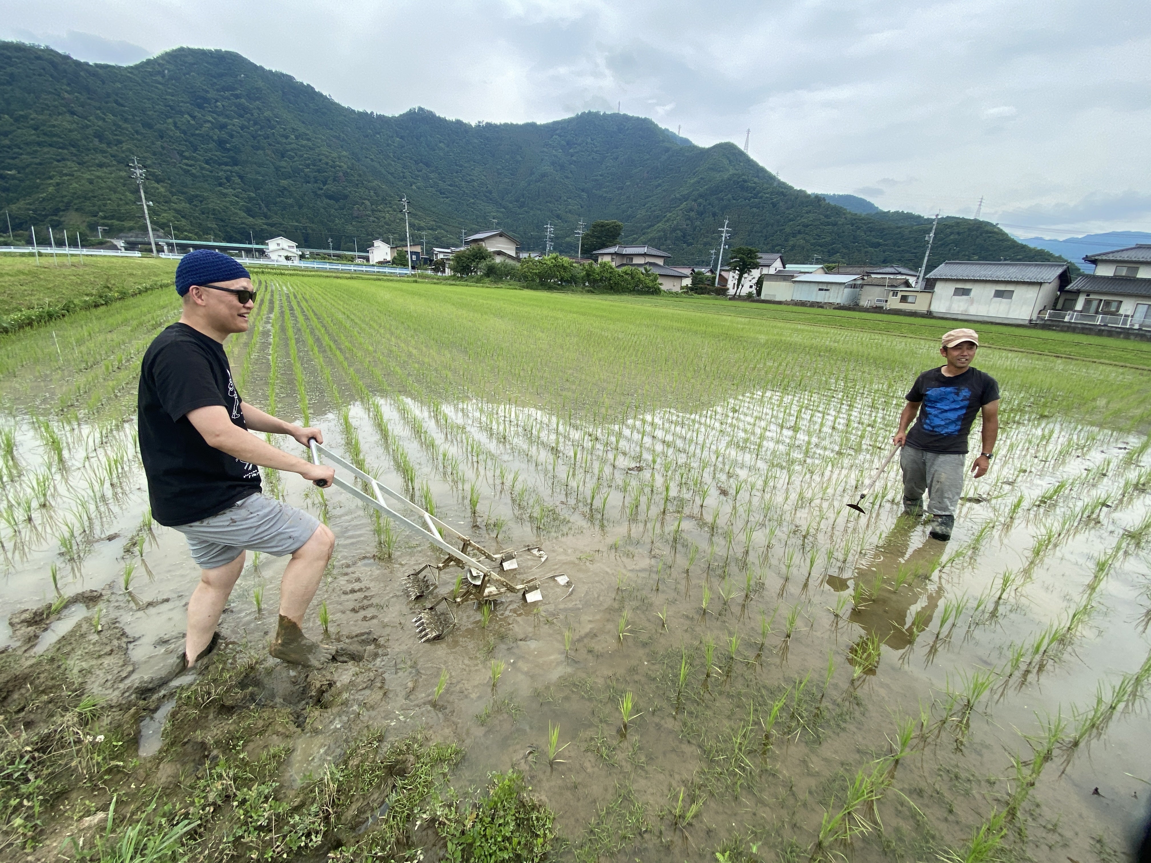 農薬を使わないで作っているため、【田打車(たうちぐるま)】という水田の除草道具を使って水中の草取りをしていきます。短いつめが多数取り付けてあり、つめが転動して水田の土をかきまわし草をとる