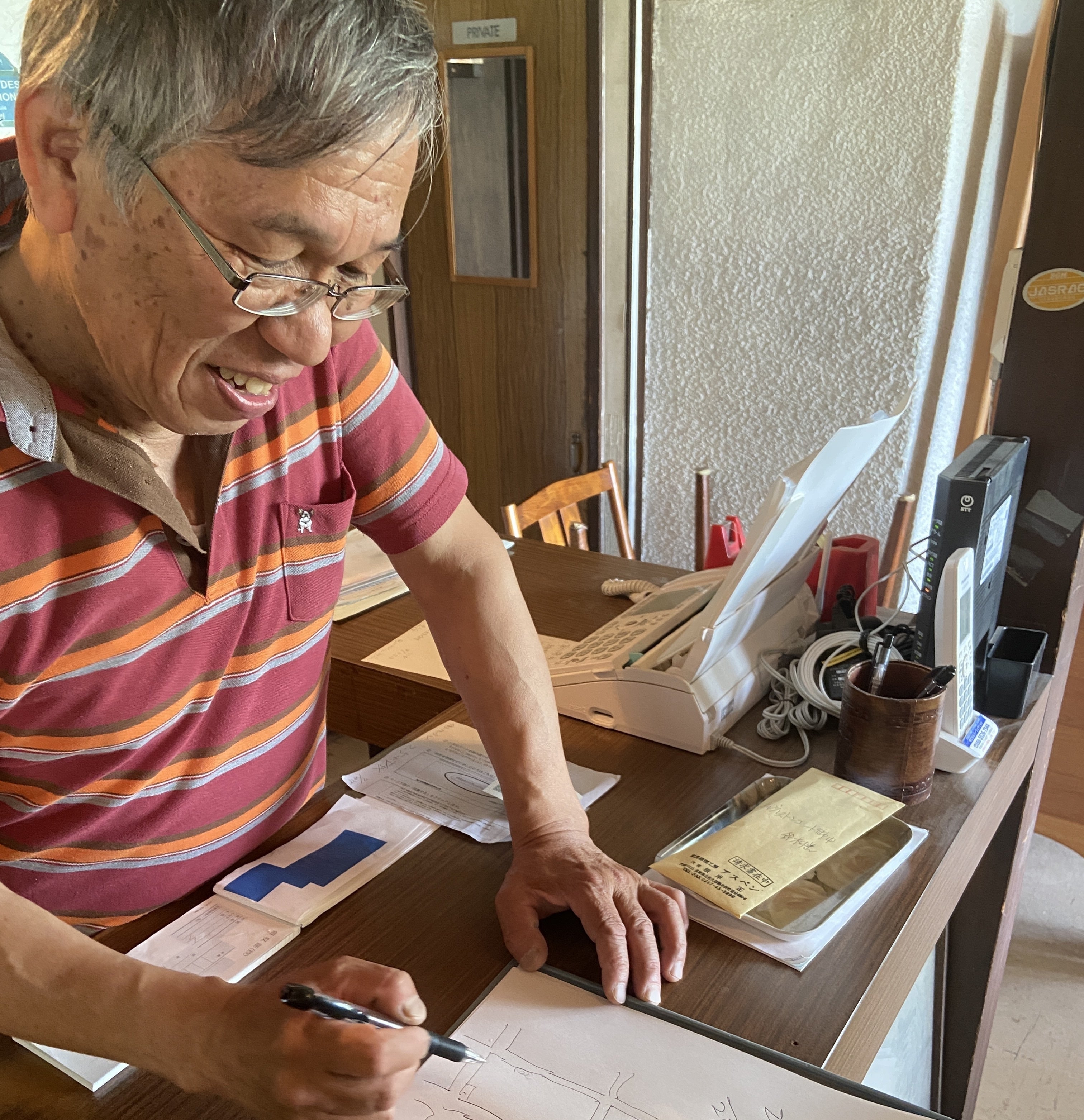 写真は、領収証を書いてもらうときに話が盛り上がって10分くらい過ぎた時の、絵です。(まだ一文字も書いていない、笑)