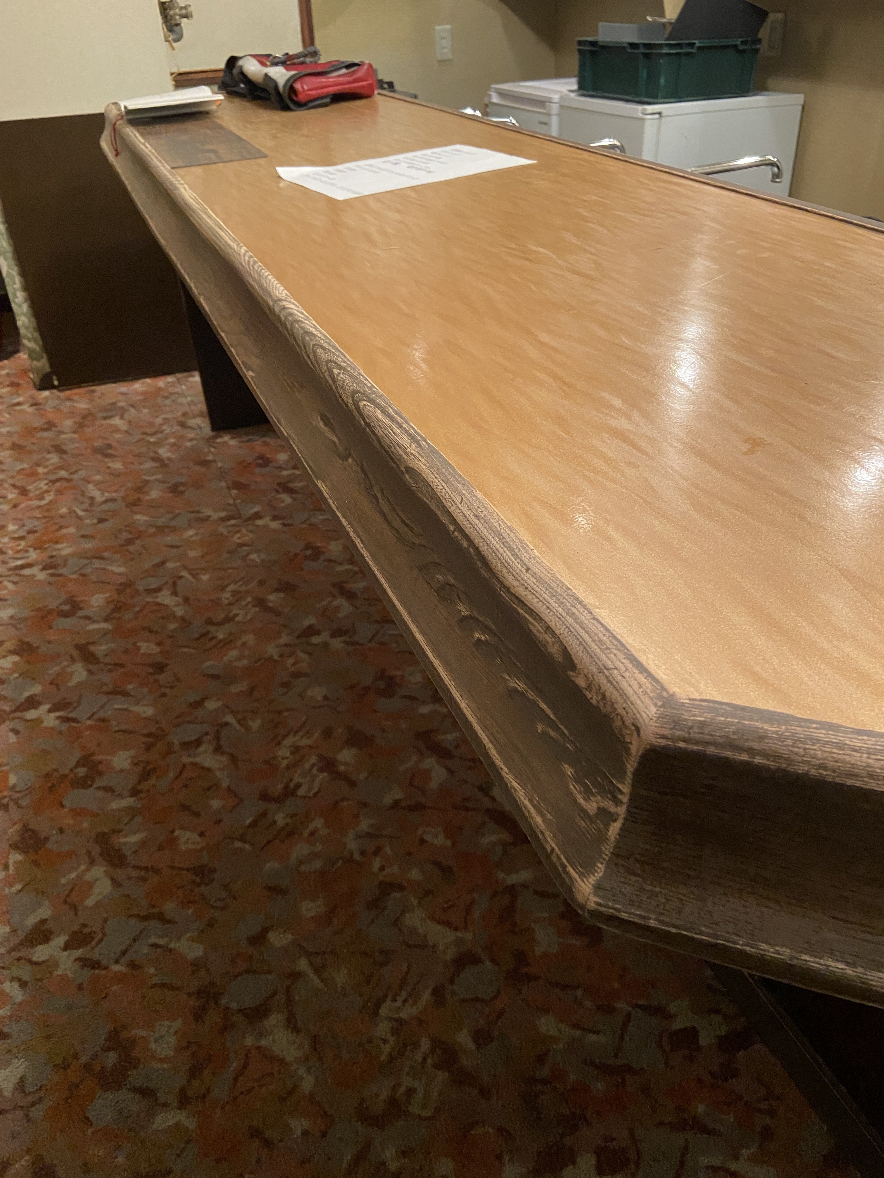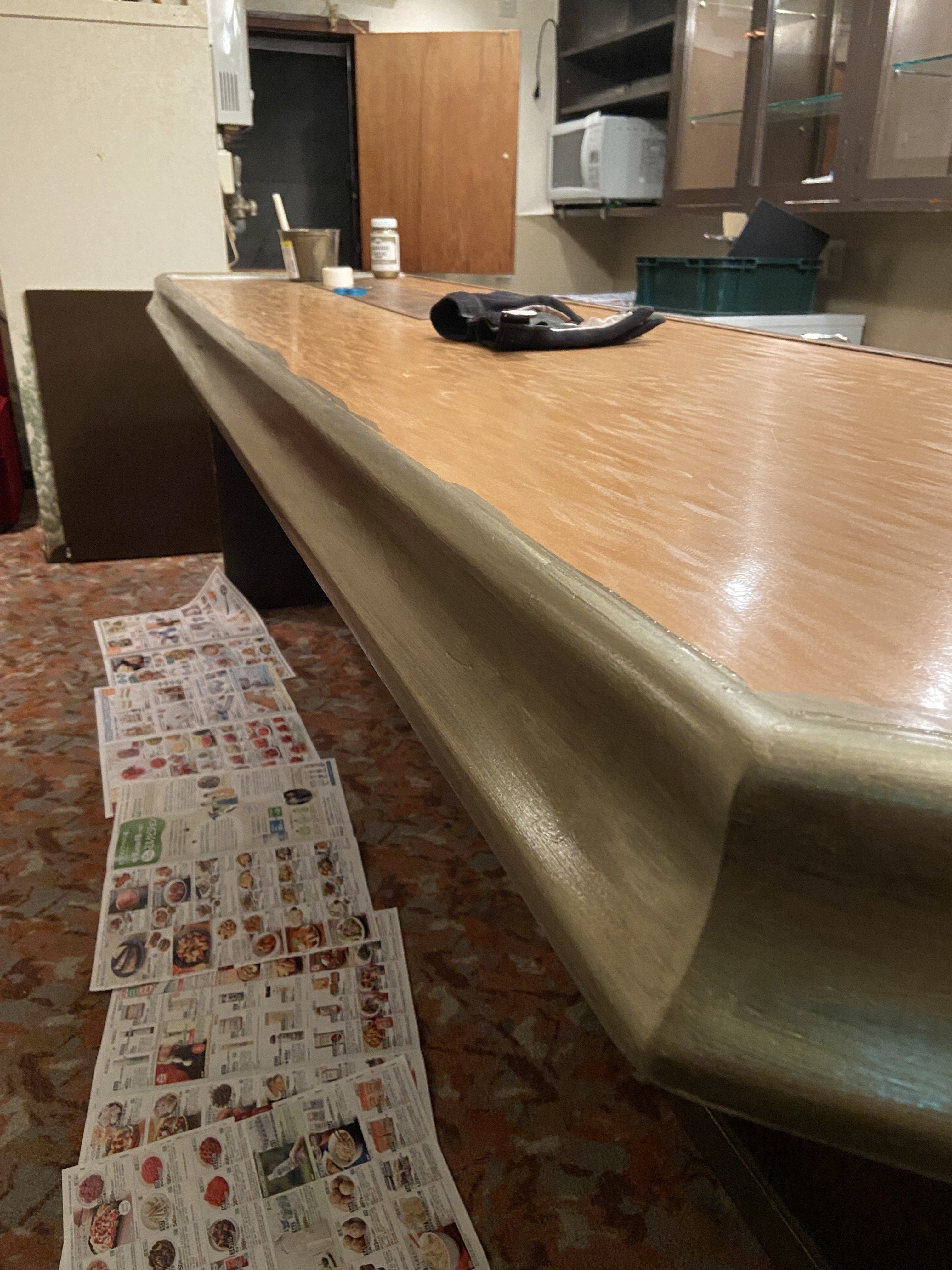内装が入る前にやってしまえば、万が一ペンキが垂れたり、ずれたりしても大丈夫なので、カウンターの縁(ふち)をレストランの仕事終わりの夜に2日間かけて塗りました。