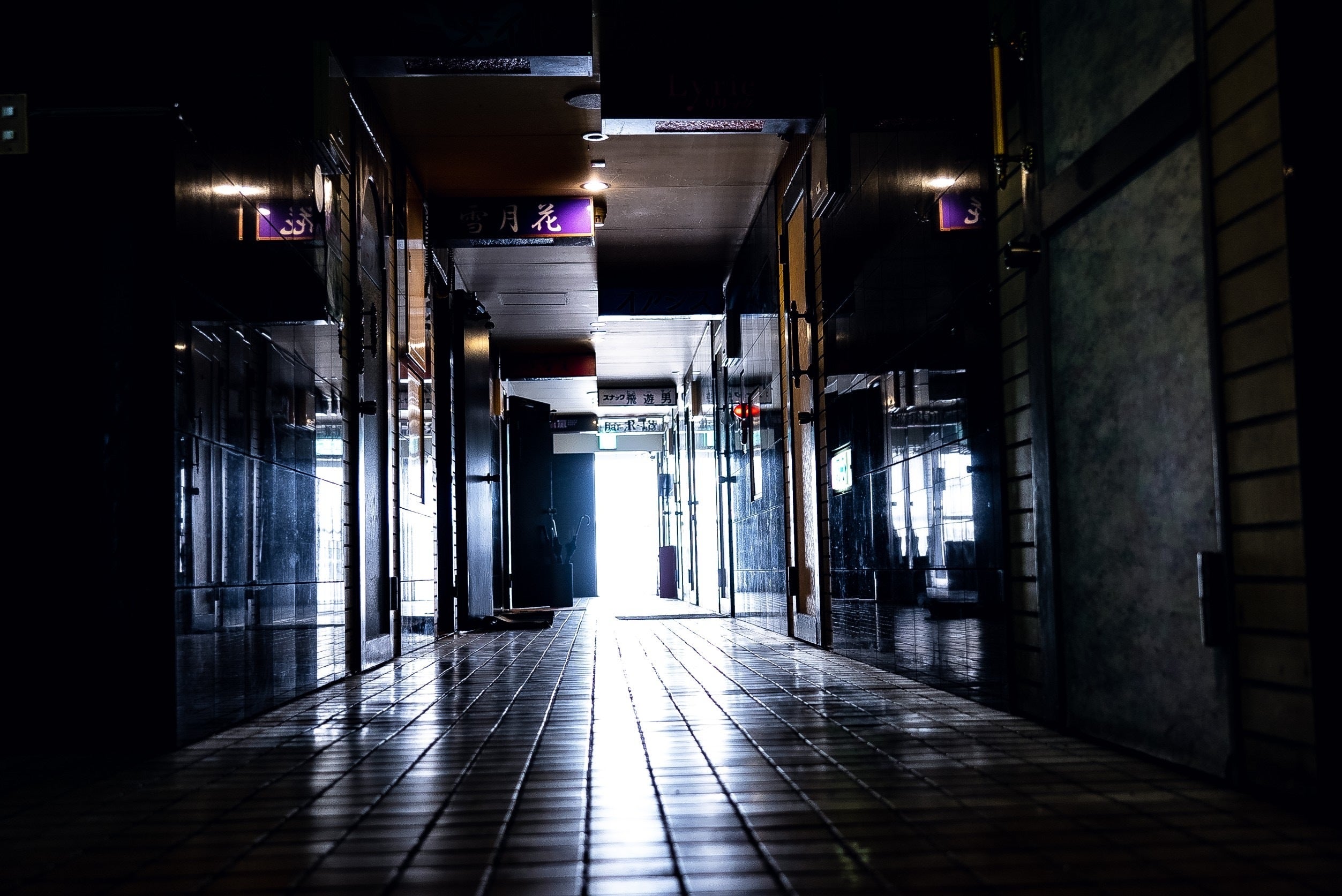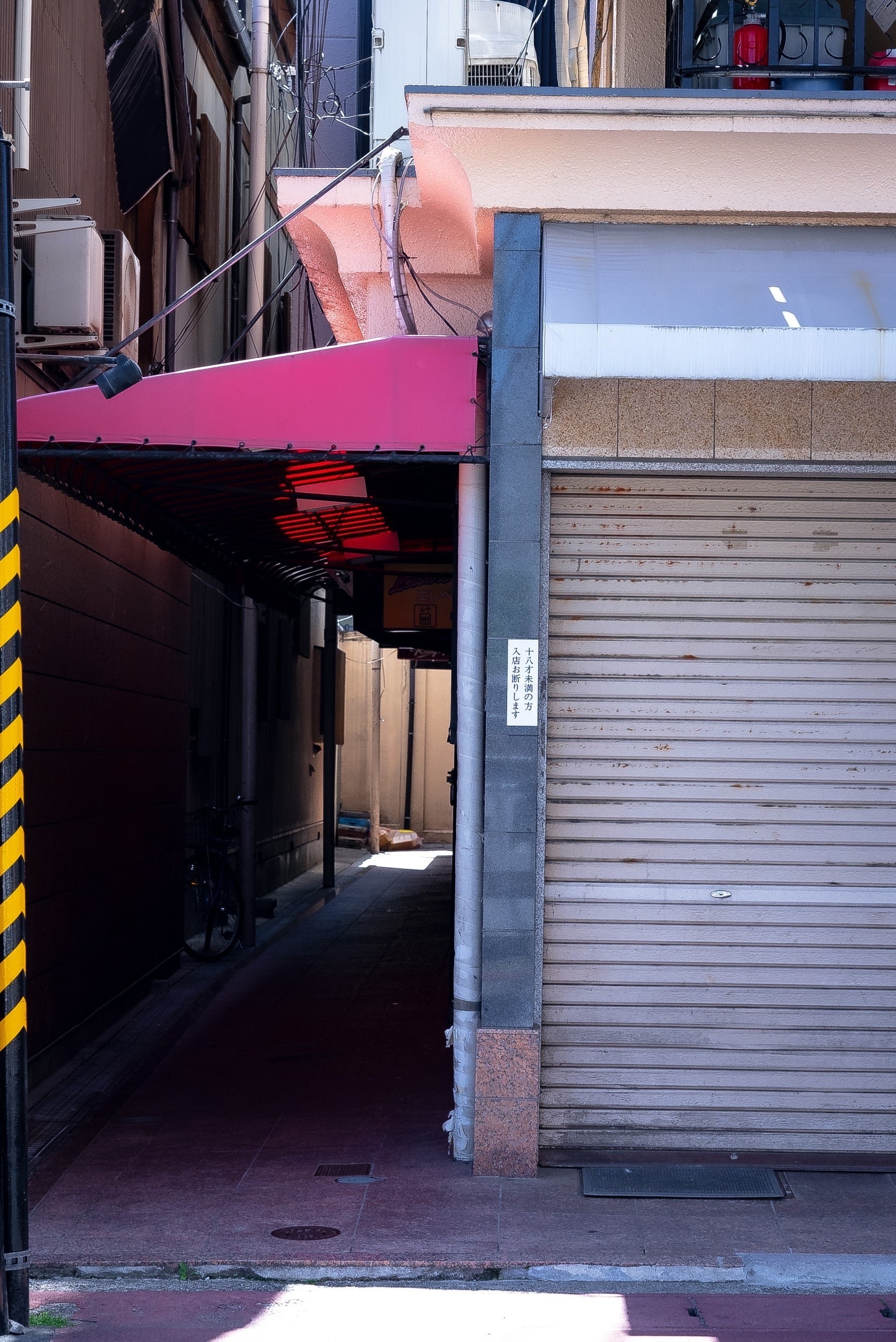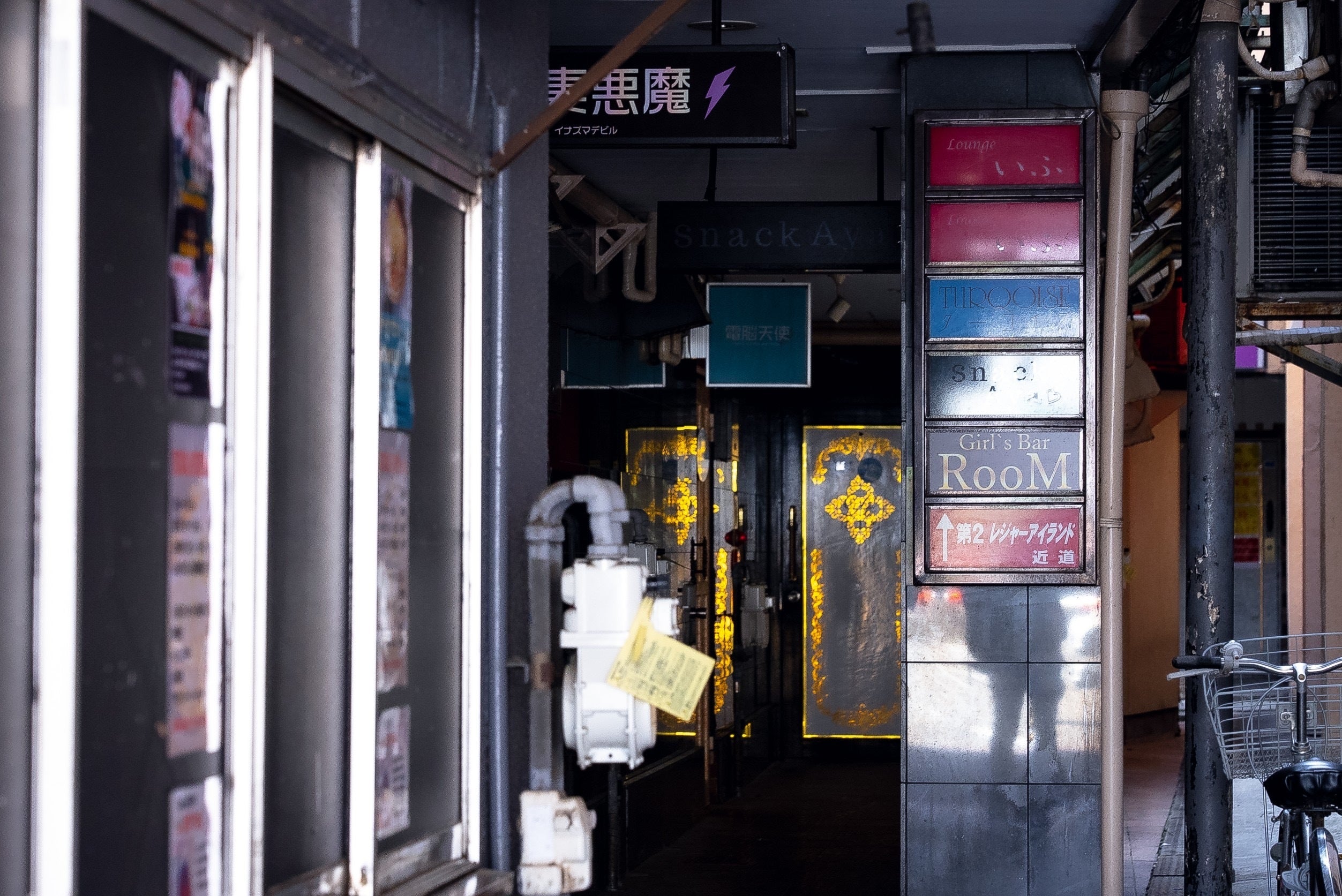 何が懐かしいのですか?って真帆ママにも聞かれましたが、まずは店舗が入っているビル。娯楽施設の需要が高まった高度成長期の1980年代に建てられた夜のお店しか入っていないこのビルは、今ではおそらく建築基準法に合わない(笑)迷路のような作りで、中の雰囲気、デザインは当時の「昭和感」満載です!入り口は下の写真の左側、赤いテント屋根の部分を進んでいきます。