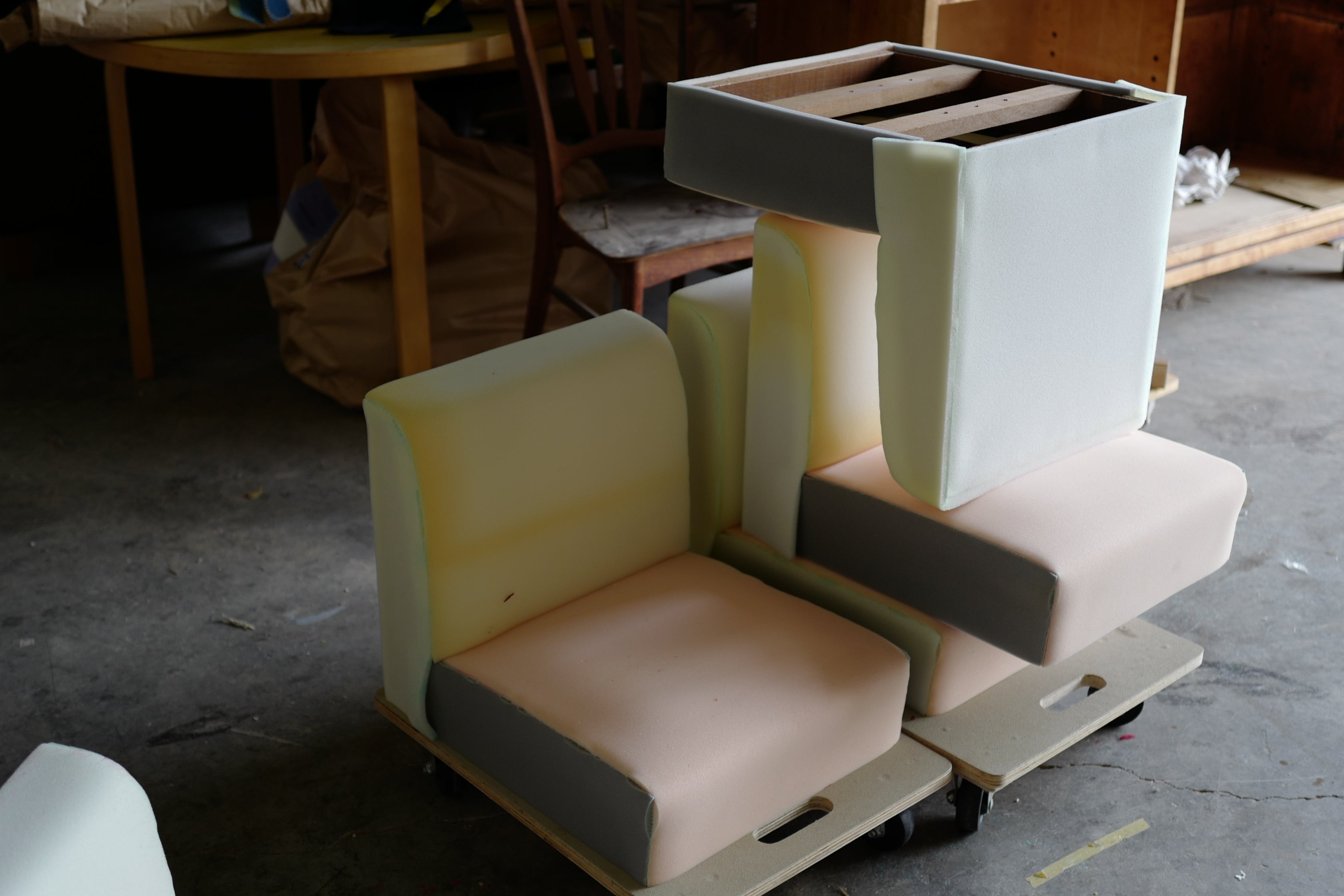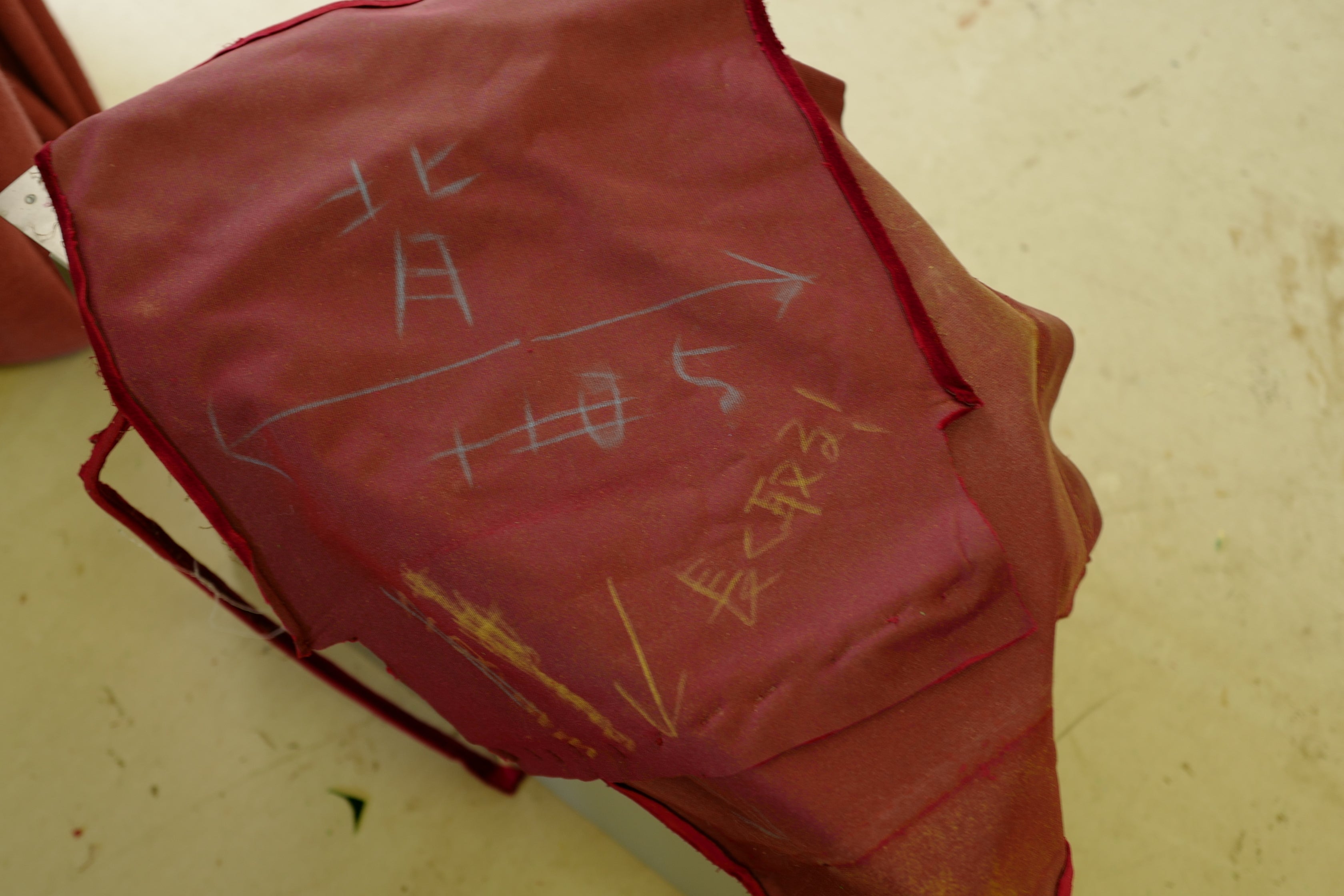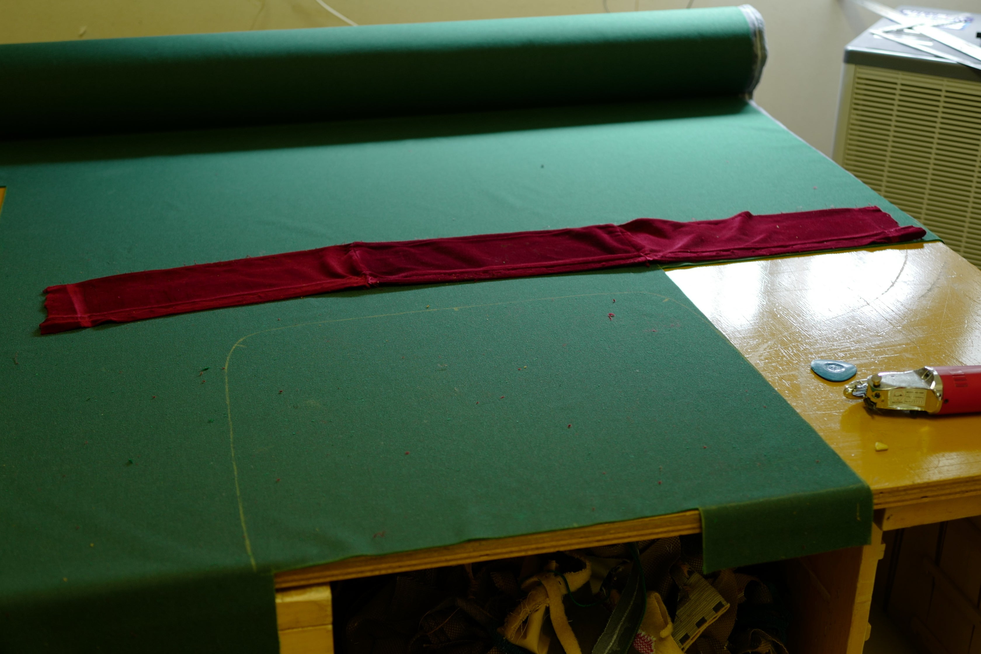 制作途中の写真が送られてきました。生地は柄なしのシンプルな無地なものを。色は赤に映える緑色で。プレオープンには間に合いそうとのことで、とても楽しみです!!