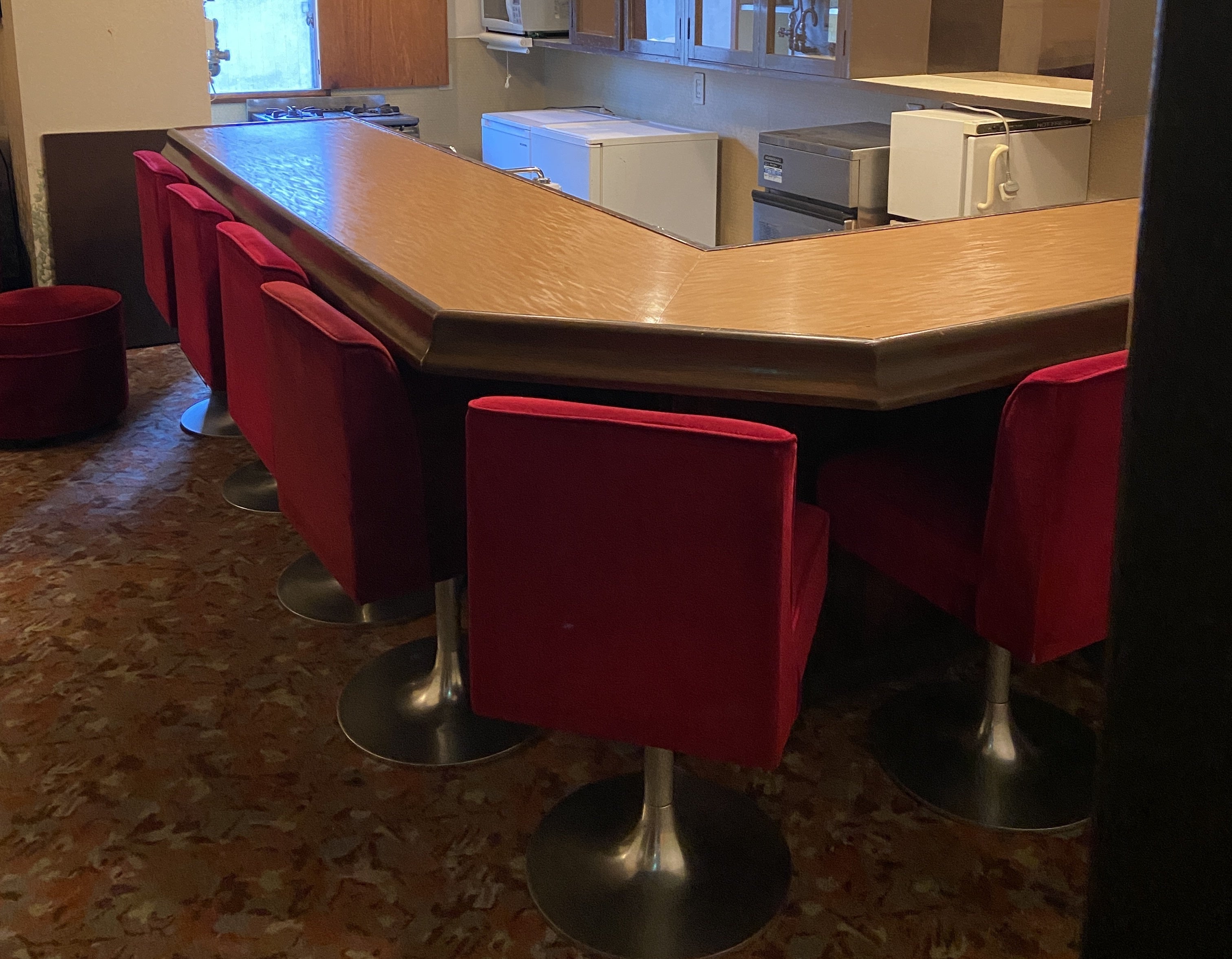 椅子自体は居抜きで残してもらっていた赤い椅子です。新しいものを買っても良かったのですが、この場所で数十年、何百人(かどうかは知りませんがw)も座ってきたなんというか、ストーリー性を感じたかったからです。
