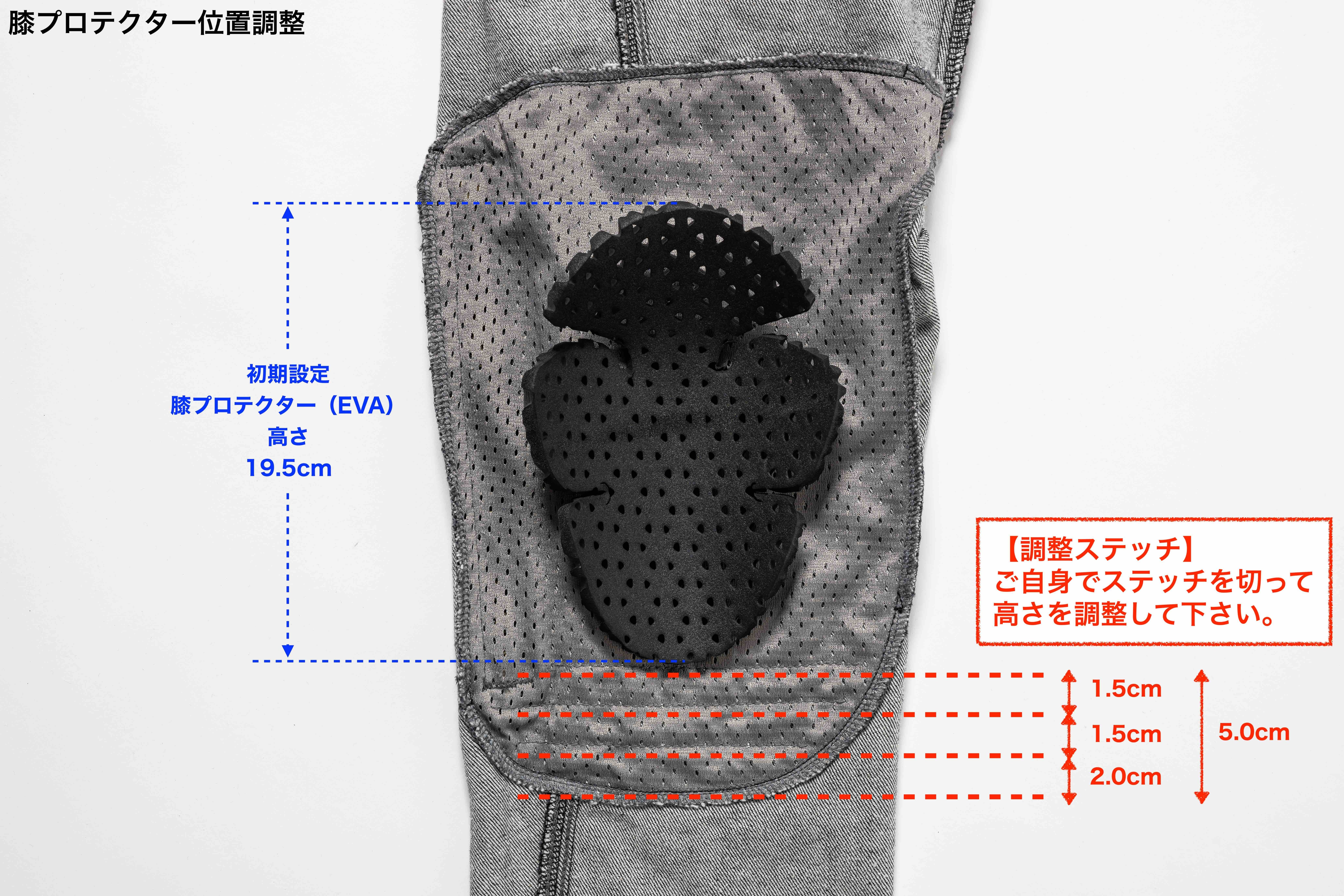 この設計で『股下問題を解決』すると同時に、膝位置(プロテクター位置)を最適化しちゃいました。