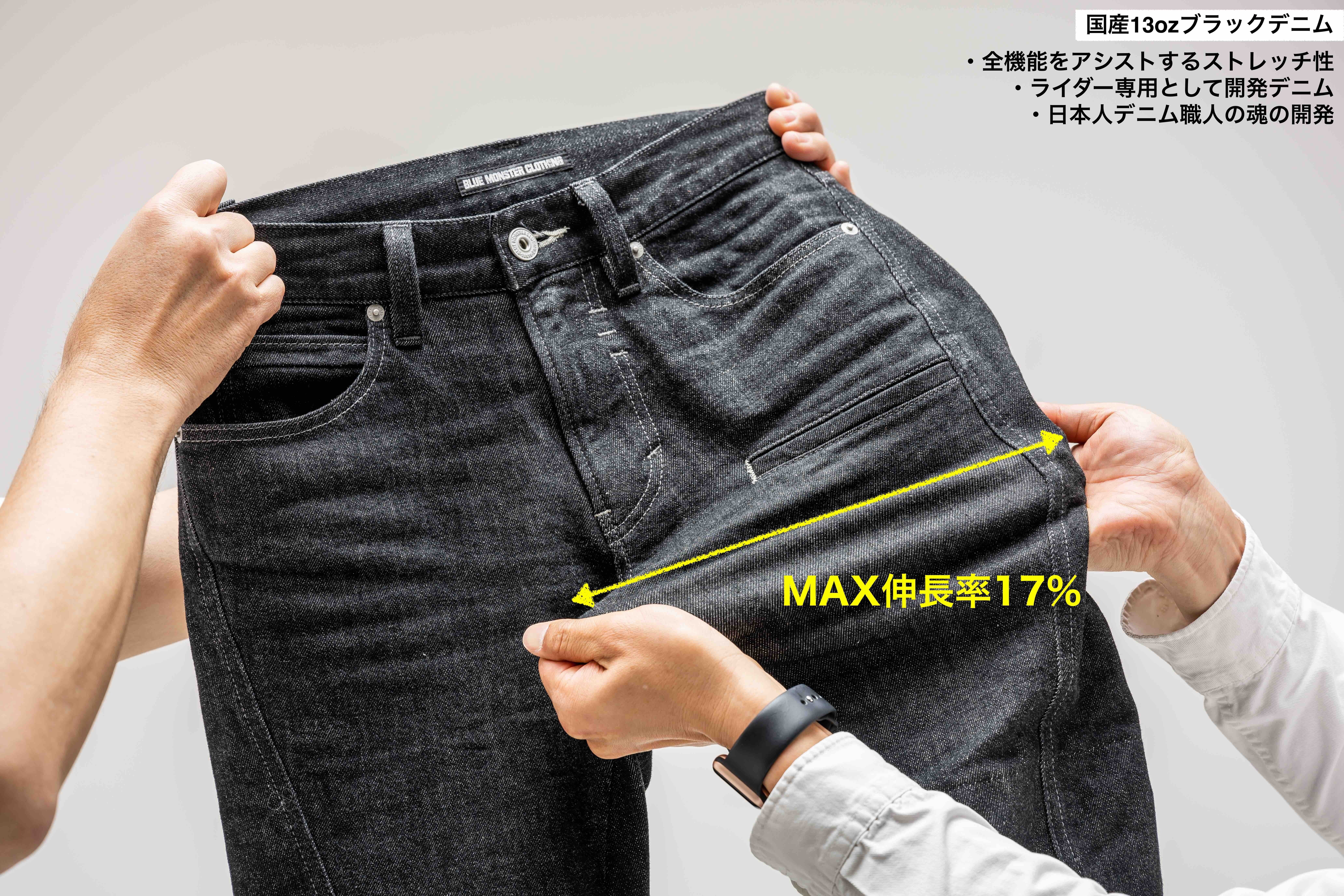 ブラックデニムは、創業130年の歴史を持つ日本が世界に誇るカイハラ社で開発された 13oz ストレッチ ブラックデニム です。ライダーが求める生地の厚さ・重さ・色・耐久性・快適性を追求しています。