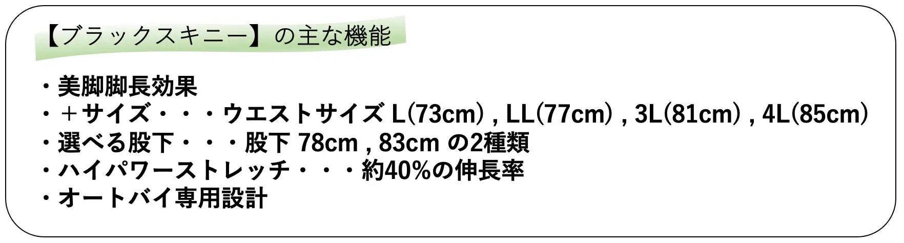 ウエストサイズは、S(65cm) , M(69cm) ,L(73cm) , LL(77cm) , 3L(81cm) , 4L(85cm) の6サイズから選べます。股下は 78cm ,83cm の2サイズから選べます。【日本人女性専用設計】ですので、ご自身の体型に合わせてブラックスキニーを穿いて頂きバイクライフをよりオシャレに快適にして頂ければと思います。