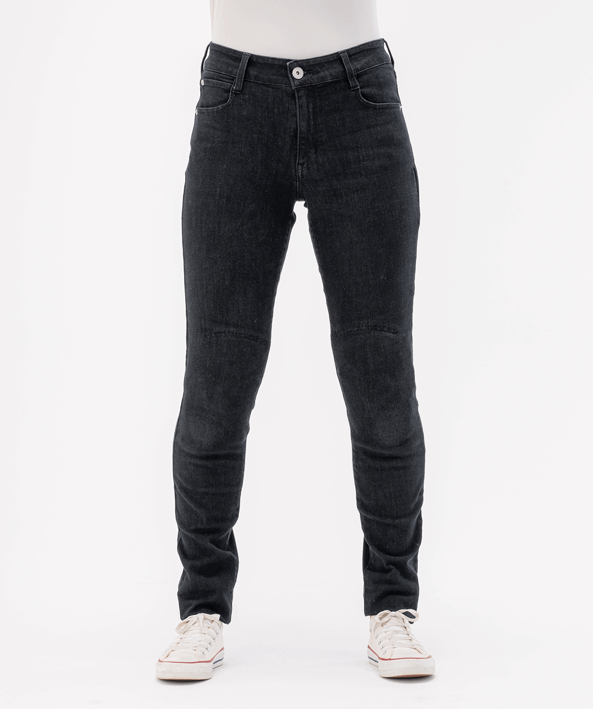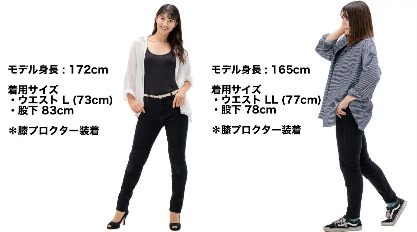 オートバイ専用設計ですが、しっかりとカジュアルシーンでも着用できファッションを楽しめる様になっています。様々なトップス・靴に合わせやすいブラックスキニーです。デザインがシンプルだからこそコーデが楽めます。膝プロテクター(膝プロテクター装着状態)も目立ちません。バイクに乗った時も降りた時も全ての女性ライダーにブラックスキニーでファッションを楽しんで頂きたいと思います。