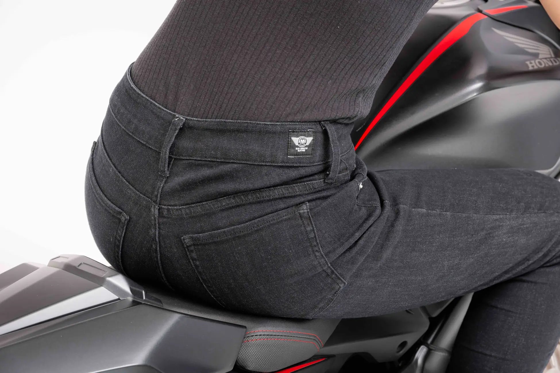 着用の快適性だけではなくブラックスキニーはオートバイ専用設計になっています。女性の体型・バイク乗車を分析しストレスを感じないパターン設計を実現しています。