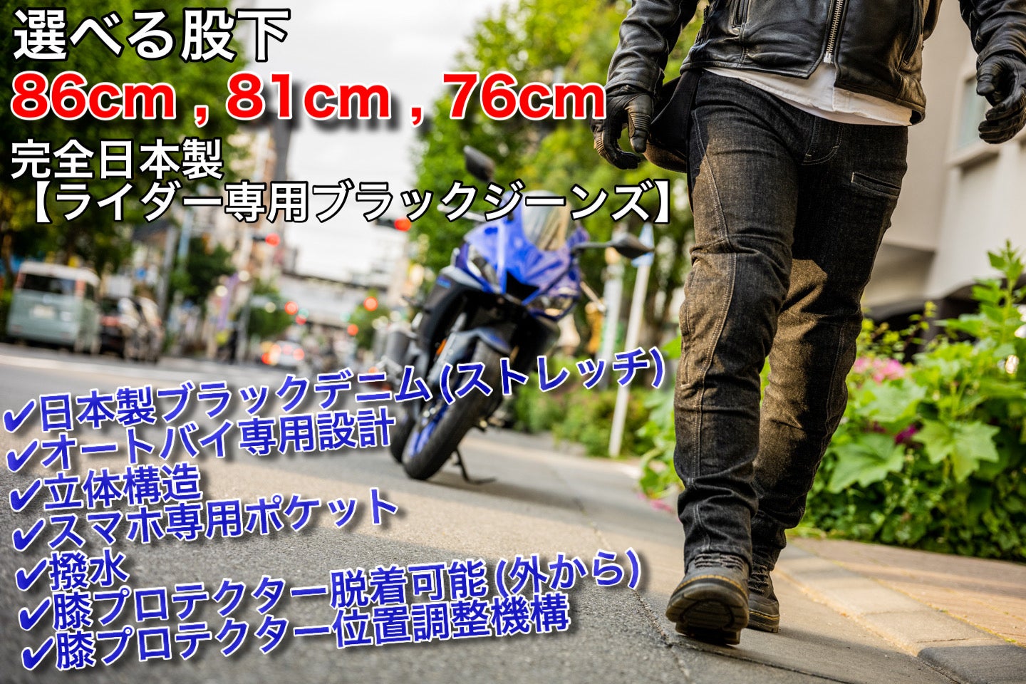 選べる股下設計だけではなく、オートバイ専用設計の様々な機能をデフォルトした完全日本製【ライダー専用ブラックジーンズ】が完成しましたよ!