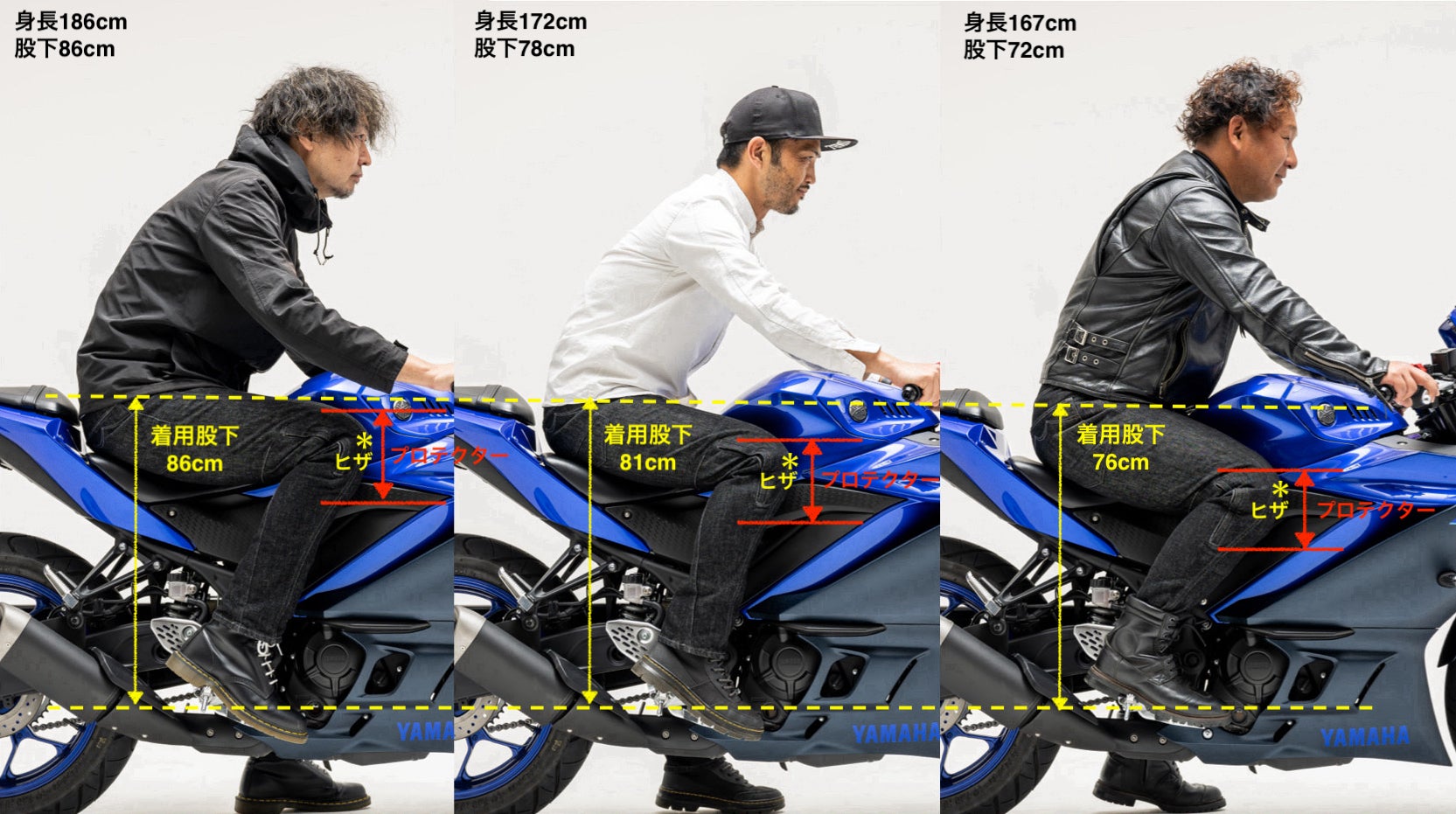 この設計で『股下問題を解決』すると同時に、膝位置(プロテクター位置)を最適化しちゃいました。