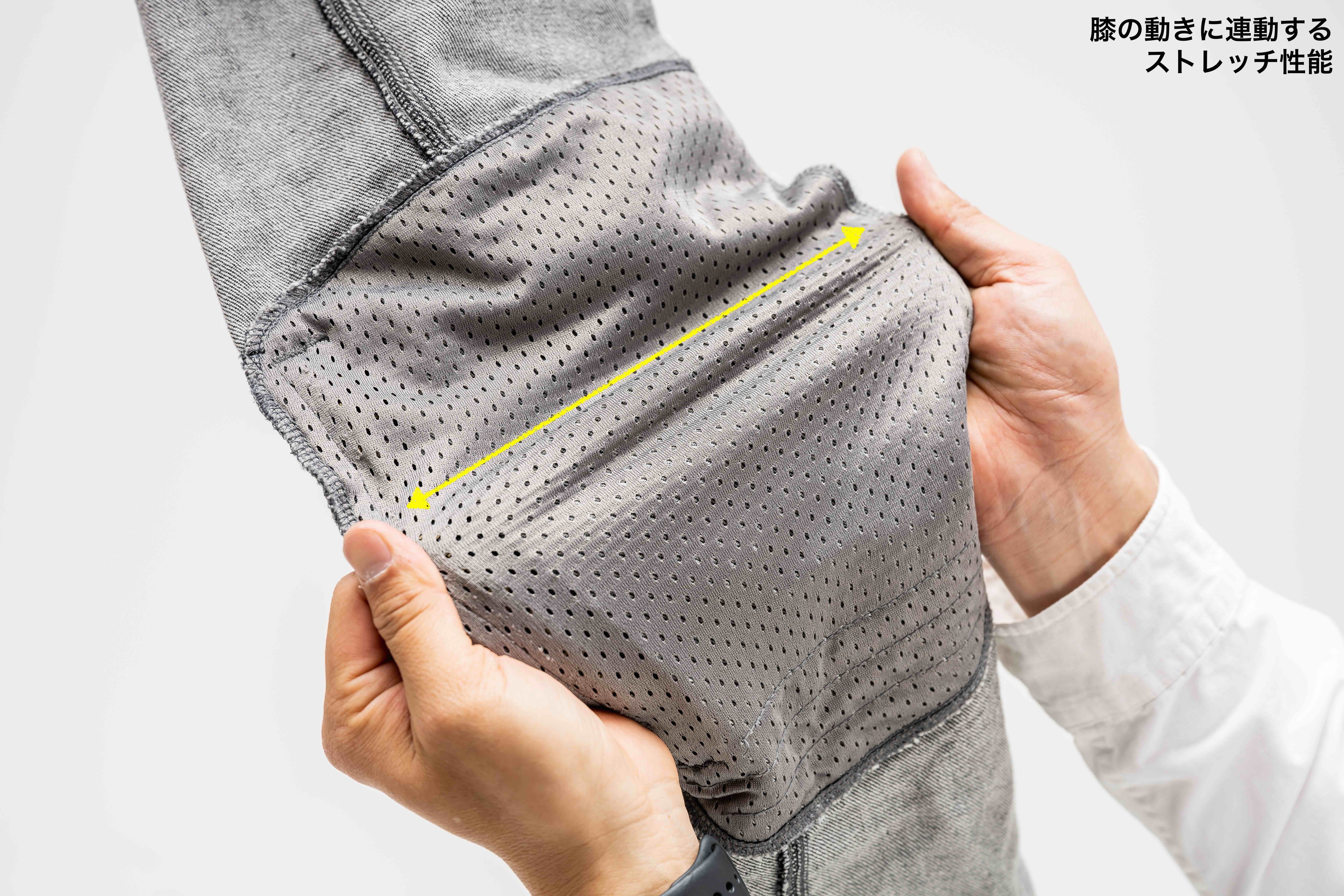 - 膝プロテクター:メッシュ構造の樹脂プロテクターが内蔵されます
