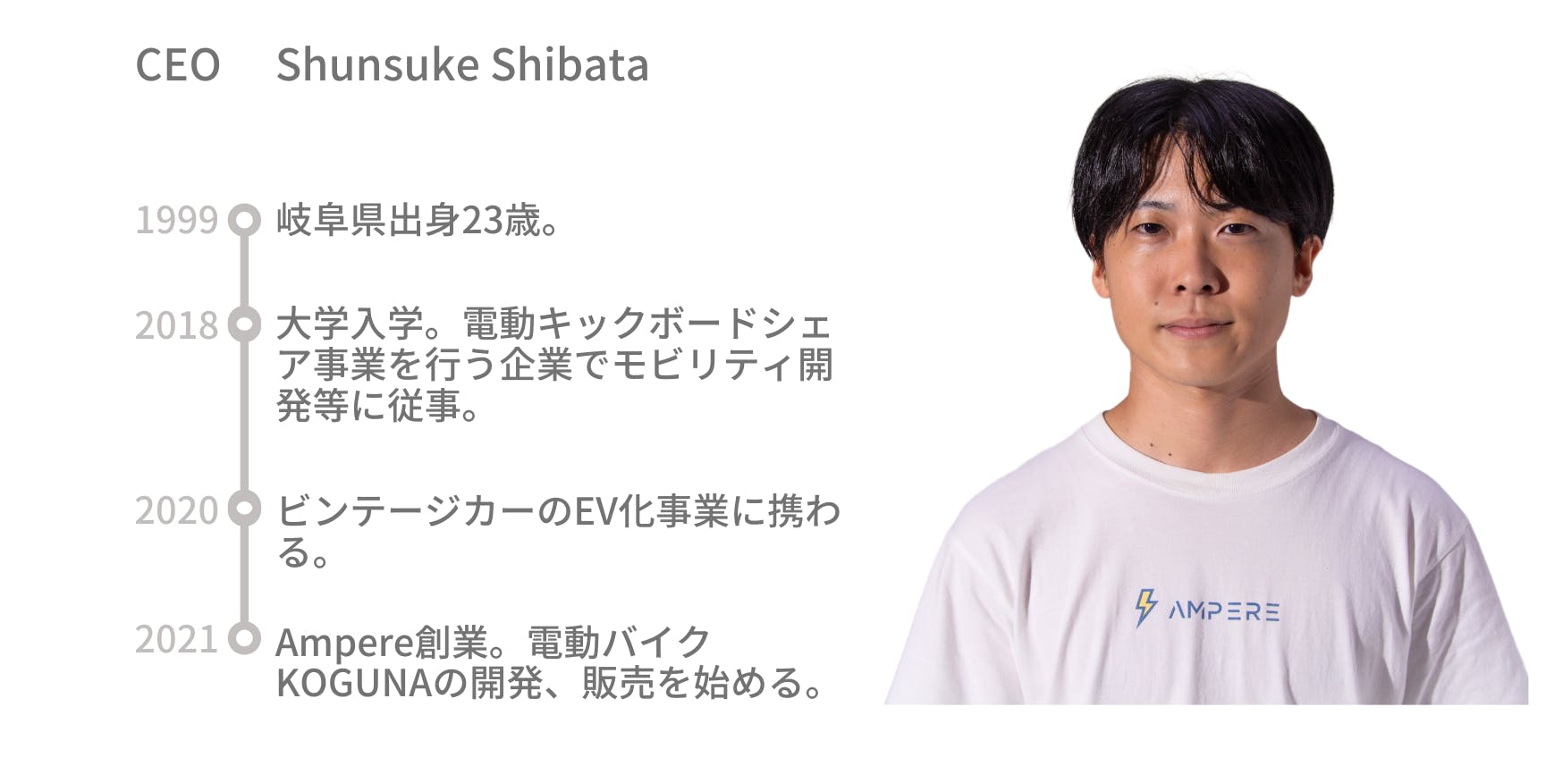 Ampereは2021年に私が21歳の大学生の時に創業しました。私は幼い頃から乗り物が大好きで、「自分の作った乗り物を街に走らせたい」「モビリティの力で移動をもっと楽しく、便利にしたい」という想いをずっと抱いていました。在学中にインターンなどで電動キックボードのシェア事業やビンテージカーのEV化事業に携わった私は、モビリティが持つ社会的インパクトの大きさに感銘を受け、Ampereを立ち上げました。