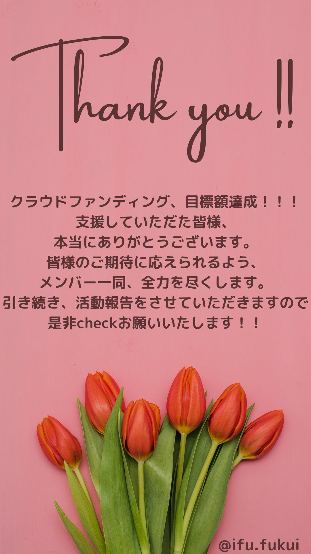 2023/06/09 10:05目標金額達成ありがとうございます!皆さんおはようございます!IFUの峰桃香です。この度、6/7に目標金額を達成しました!皆様本当にありがとうございます!!!私にとっても団体にとっても初めての挑戦でわからない事だらけ、不安だらけでしたが、このクラウドファンディングを通して私たちは色々な方に支えていただいているのだと実感しました!(感動して号泣したのはここだけの秘密(*^^*))以下、代表の増田ふうからコメントをもらったので是非見てください!「まずはご支援いただいた皆様、本当にありがとうございました。4月に立ち上げたばかりの学生団体なので、正直「集まったらラッキー」の精神でした(笑)「結果はどうであれ全力を尽くす」団体のスローガンに定めているわけではないのですが、周りのメンバーに恵まれ団体にこの雰囲気が漂っている気がします。今回のクラウドファンディングもメンバーの峰ももかが本当に頑張ってくれました。圧巻です。まだ立ち上げて2か月満たない団体ですが、福井の方々、その周りの方々の温かさのおかげで、良いスタートを切れていると我ながら感じております(笑)代表である私が一番未熟なのですが、有能で活発なメンバーに恵まれ、団体が画期的なものに近づいていることを感じています。毎日「IFU」のことで頭がいっぱいです(笑)大好きな福井県に少しでも恩返ししたい。まだまだ恩返しには程遠いかもしれないですが、私は毎日福井を感じられて幸せです。改めて応援して下さった皆様、本当にありがとうございました。「地元福井」の人の温かさ、再確認しております。本当にうれしいです。ご期待に応えられるよう、メンバー一同精一杯頑張ります。今後とも私たちの想いが形になり、一人でも多くの方が福井県との繋がりを感じられますように。。。」これからも「福井県産食堂」の準備頑張って進めていきます!進捗報告も行うので楽しみにお待ちください! もっと見る
