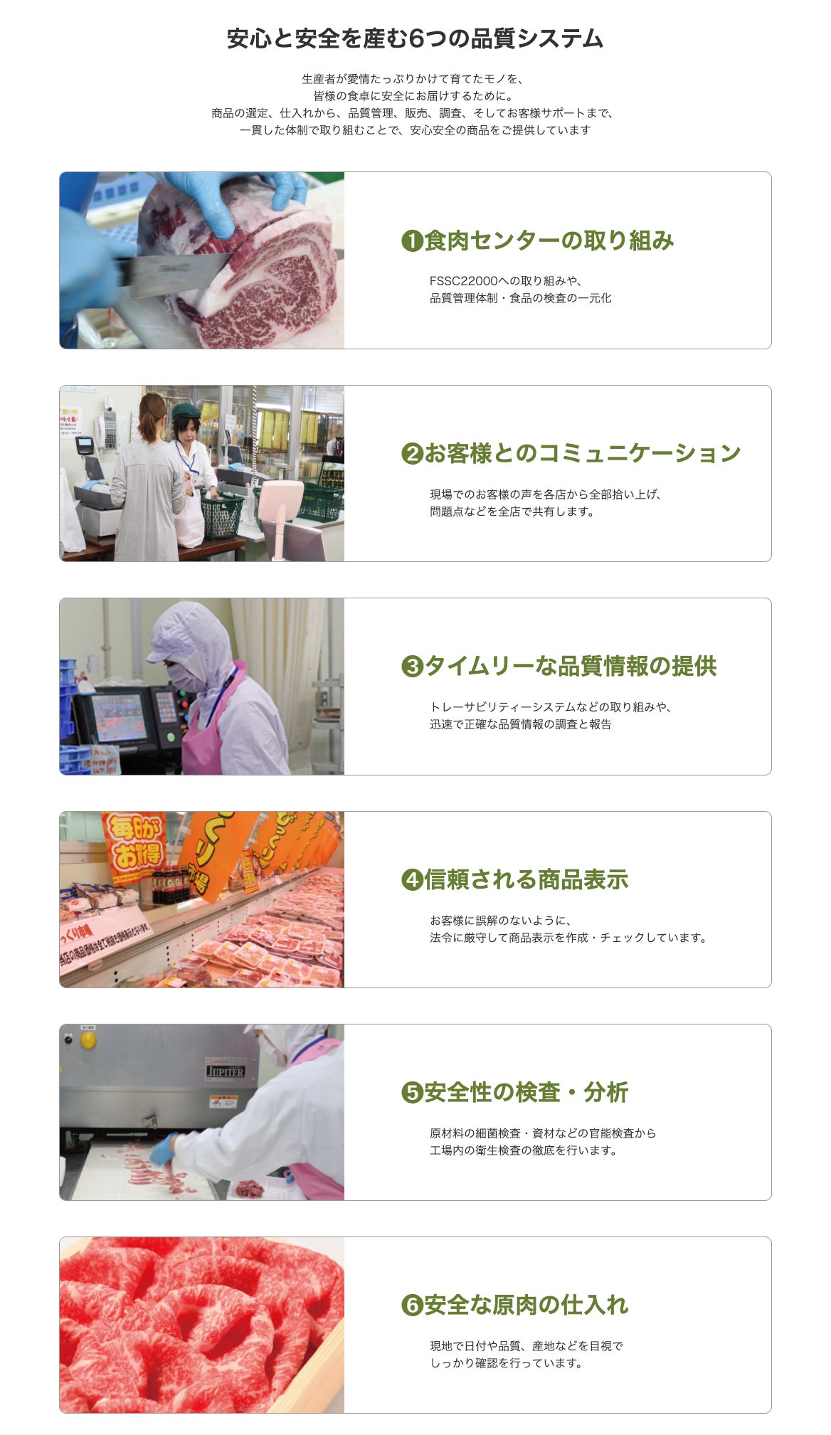 安心と安全を産む6つの品質システムを基準とし、生産者が愛情たっぷりかけて育てたモノを、皆様の食卓に安全にお届けするために。商品の選定、仕入れから、品質管理、販売、調査、そしてお客様サポートまで、一貫した体制で取り組むことで、安心安全の商品をご提供しています。