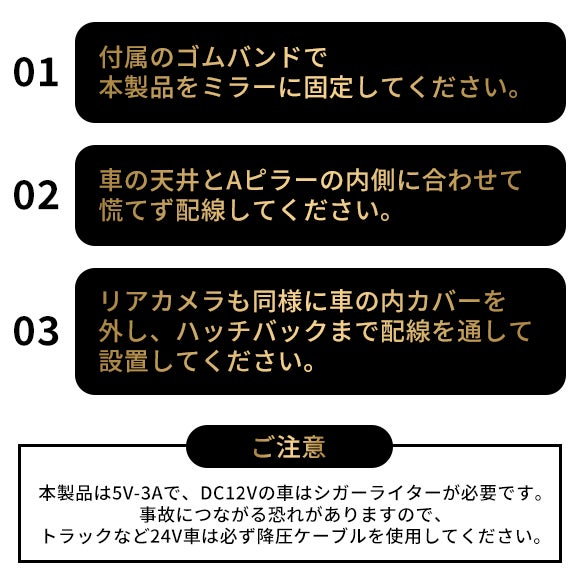 A:本体は、ゴムバンドでルームミラーに取り付けて、シガーソケットに接続するだけですが、リアカメラは、配線を天井裏やピラー内部に這わせる必要があります。ご自身での取り付けが不安な方は、ディーラーや専門業者等にご依頼ください。