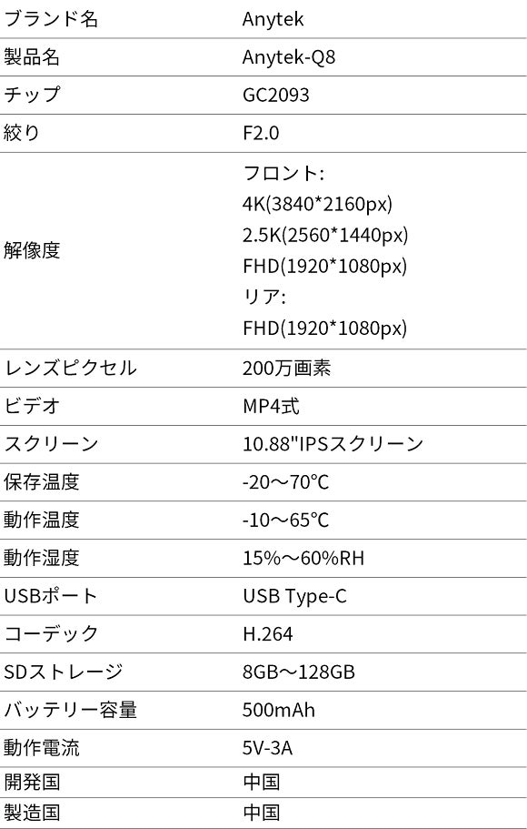 「Anytek-Q8」は最大128GBの大容量ストレージ対応で、最大11,000時間の連続録画が可能。さらにループ録画(自動上書き)機能も搭載され、自動で最新の映像が上書きされます。