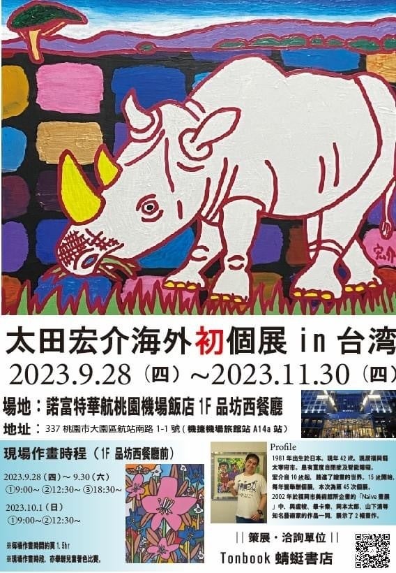 2023/09/08 17:30こんにちは。画家 太田宏介の兄・信介です。今回のクラウドファンディング終了から、早いもので1ヶ月が経ちました。改めてその節はありがとうございました。そしていよいよ、今月末から台湾での個展が開催されます。チラシもできあがりました。詳しい場所は「ノボテル 台北 桃園国際空港ホテル」内の「ピンファン洋食レストラン」で、会期は9/28(木)〜11/30(木)です。台湾では曜日を数字で表すのですが、なかなか馴染めません(笑)翻訳の方など、たくさんの方々のお力を借りての開催です。お知り合いやご友人に台湾の方がおりましたら、ぜひこの個展をお伝えいただけたらと思います!また、もしタイミングよく日本から台湾に行かれる方もおりましたら、お立ち寄りいただけると嬉しいです。台湾での様子は、インスタライブ等でも発信予定です。ぜひチェックしてみてくださいね。▼Instagramhttps://www.instagram.com/kousuke.ohta/▼公式HPhttps://www.kousuke-ohta.com/よろしくお願いいたします! もっと見るはじめてのクラウドファンディングが終了しました!