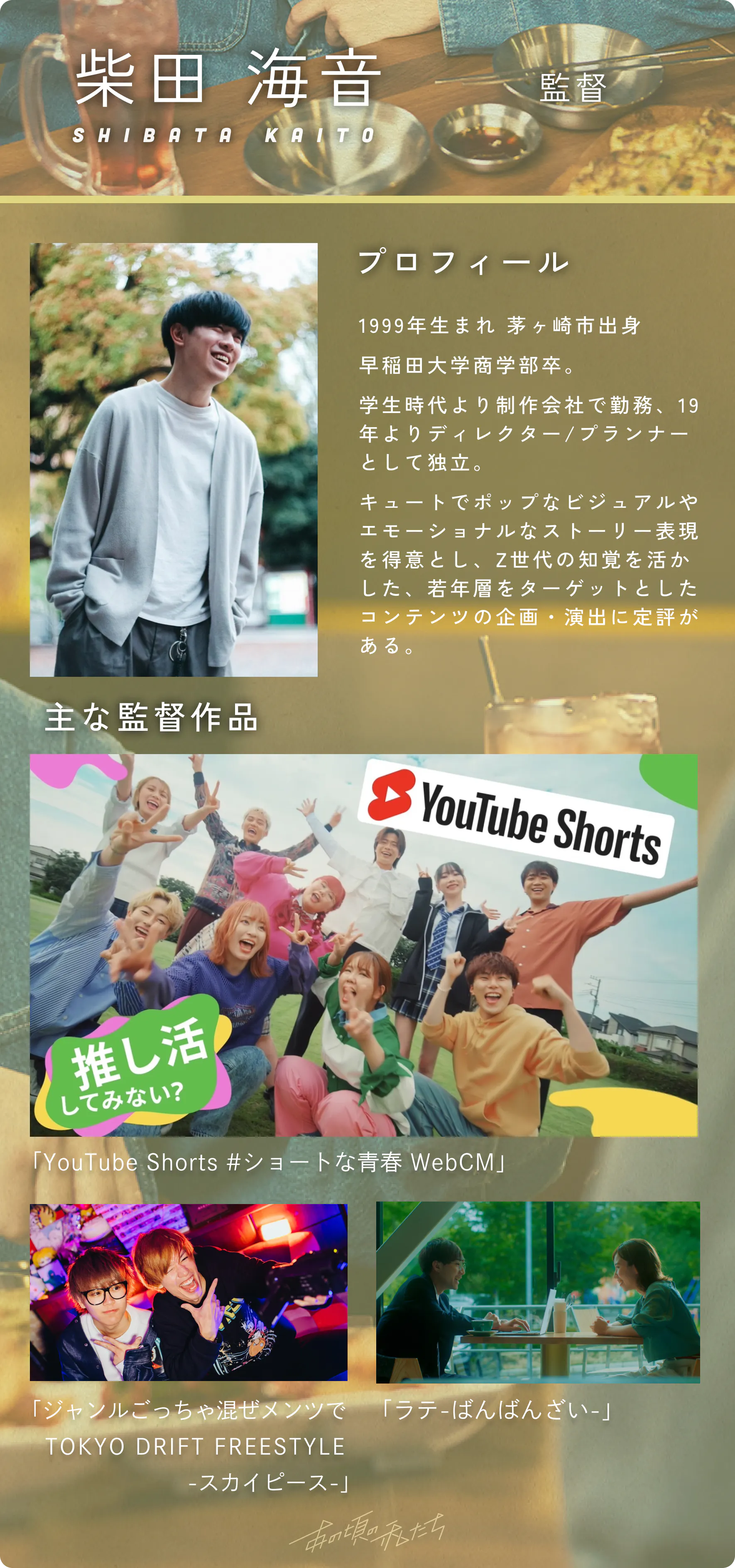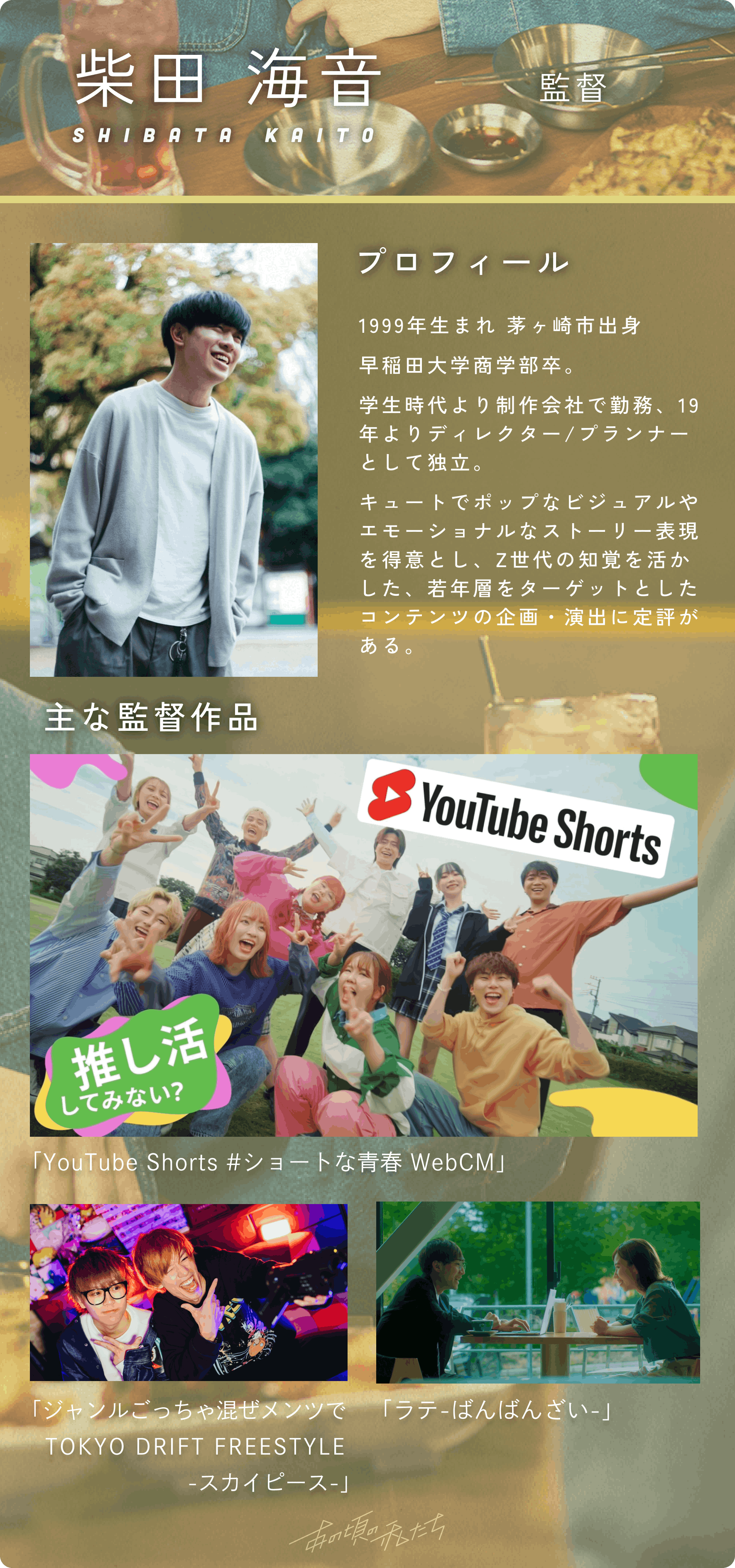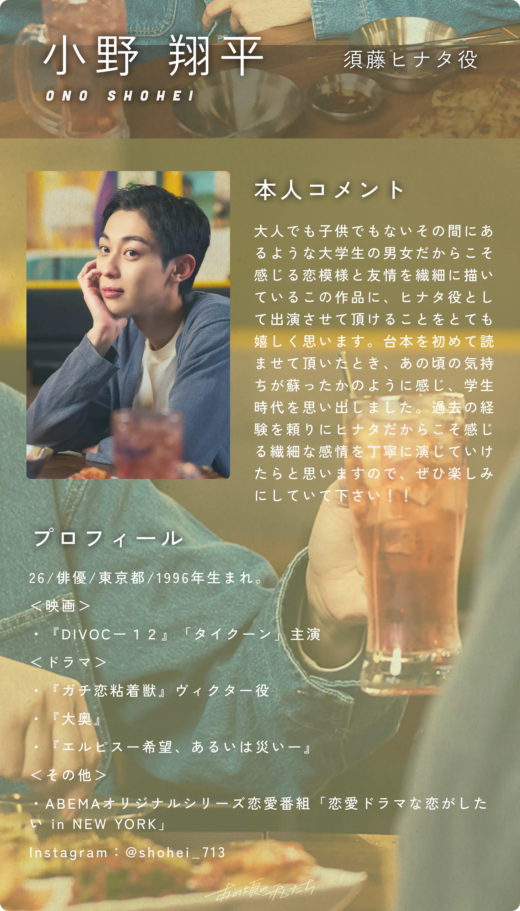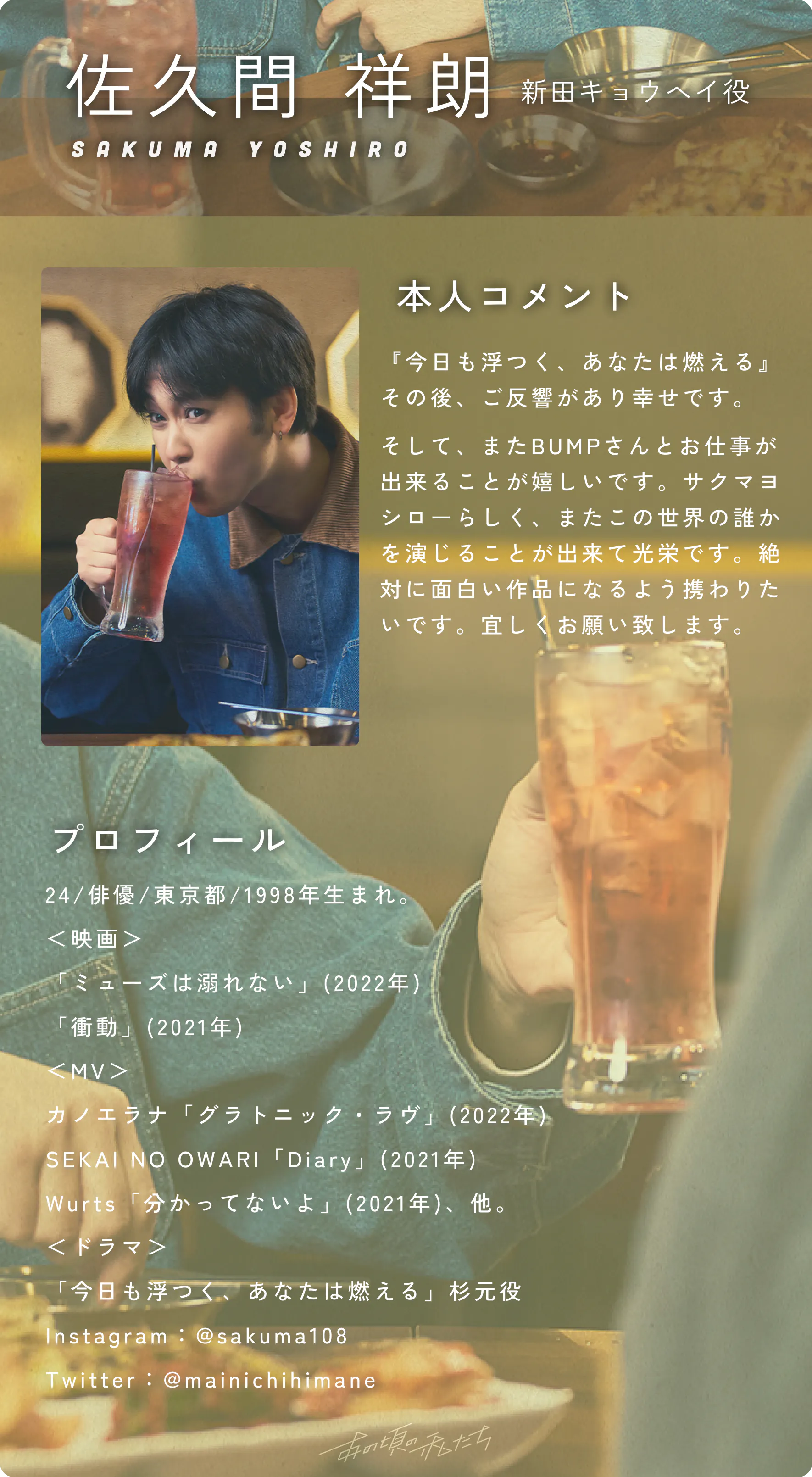 2023/05/30 15:35こんにちは!私たちのクラウドファンディングに興味を持っていただきありがとうございます!お知らせです!皆様にご紹介したい商品がございます。その一部をこちらでご紹介いたしますので、ぜひご覧ください。【商品名】フォトブック【特徴】フォトブックでは作品の世界観を軸に、役のキャラクターだけではなく撮影裏側の雰囲気を見せることも大切にしました。キャスト様の熱心な姿や他の共演者さんとの関わりを見せることで、もっと応援したいと思ってもらえる・より作品を好きになってもらえることを目指しております。具体的なデザインについては、ノートのようなグリッドの上に写真を散りばめて配置していくことで、写真アルバムのような雰囲気を作りました。「あの頃の私たち」の懐かしさやエモさ、楽しさの感じられるものを目指しました。【デザインレイアウト】*名前の上の箇所にキャストそれぞれの電子サインが入る予定でございます。また、それぞれのソロショット(演技シーン、オフショット)だけのページもございます。是非皆様のご支援を心よりお待ちしております!何かご質問やご要望がございましたら、お気軽にお知らせください。私たちいつでもお手伝いいたします。引き続きご支援をどうぞよろしくお願いいたします!BUMP運営事務局 もっと見るご支援いただいた皆様限定のオフショット