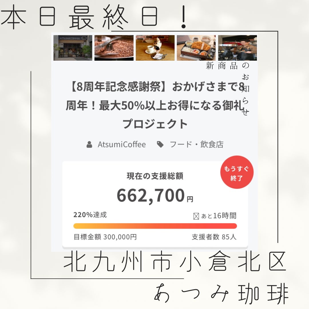 2023/07/31 07:54今日で今年の7月も終わり。早いですね!同じく、このあつみ珈琲8周年記念、感謝のクラファンも本日が最終日となりました。「応援はしてるし参加もしたいけど、あつみさんが損する企画だから躊躇しちゃって」というお声も多くいただきますが、この企画は、私たちにもありがたいことが満載なのです。まず第一に、当店、いろいろな事業を同時に行っていますが、需要がどこにあるのかというリサーチにものすごく役立っています。更に、これだけの方が応援してくれている、信頼して先に注文してくださってるのだから、何があっても皆様にリターンをお返しして、9周年を迎えるぞ!!!!という、私たちのモチベーション爆上げ計画に多大な貢献をしてくれてます。実はこれが一番かもしれません。知り合いの飲食店さん達のお話しもよく伺うのですが、このご時世、本当に私たちも、そしてお客様も生活するのに大変なことが多い状態になっていて。こんな時に何ができるか、何をすべきかと、考えさせられることが多いです。この企画は、お客様もお得になり、そして私たちも力をもらえるものとなっています。ですので、参加くださっている皆様には心から感謝しています!!スケジュール的には、8月に集計や準備などを整え、9月頃からご案内していく予定ですが、8月の後半には使いたい!というお声も多いので、少し頑張って早めに準備したいと思います。お得にあつみ珈琲を楽しんでいただけるこの企画も本日23:59まで!是非使えそうなものがあったら、ご利用ください〜 もっと見る