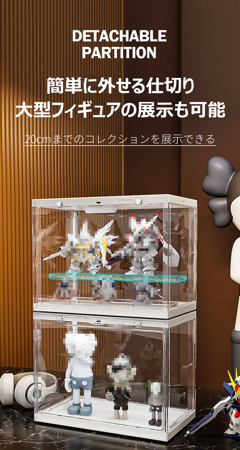 2023/06/27 16:19はじめまして。株式会社王道エンターテインメントです。LEDライト付き高透明度ディスプレイケースに興味を持っていただきありがとうございます。今回は、ディスプレイの案をいくつかご紹介したいと思います。▼本製品と付属品(仕切り板)のみでのレイアウト①仕切り板1枚(中段)②仕切り板1枚(中段)中段に仕切りを設置すると、2段に分けてCDを収納できます。▼本製品と付属品と100均アイテム①ディスプレイラックディスプレイラック + 仕切り板1枚(下段) + 仕切り板2枚(下に縦で置く)②ディスプレイラックディスプレイラック + 仕切り板2枚(下段 + 中段)中段の板にラックをかけることで奥行きを持たせられます。③ディスプレイスタンドディスプレイスタンド + 仕切り板3枚(全て下に置く)ケース内にディスプレイスペースと収納スペースを作れます。筆者は今回載せたレイアウトの中でこれが一番好きです。100均アイテムと組み合わせることで中身のレイアウトの幅が広がります!今回使用したものが下の2つです。ディスプレイラックディスプレイスタンド仕切り板にアイテムを追加すると様々なレイアウトを考えられて楽しい商品です。引き続き『LEDライト付き高透明度ディスプレイケース 』をよろしくお願いいたします! もっと見る
