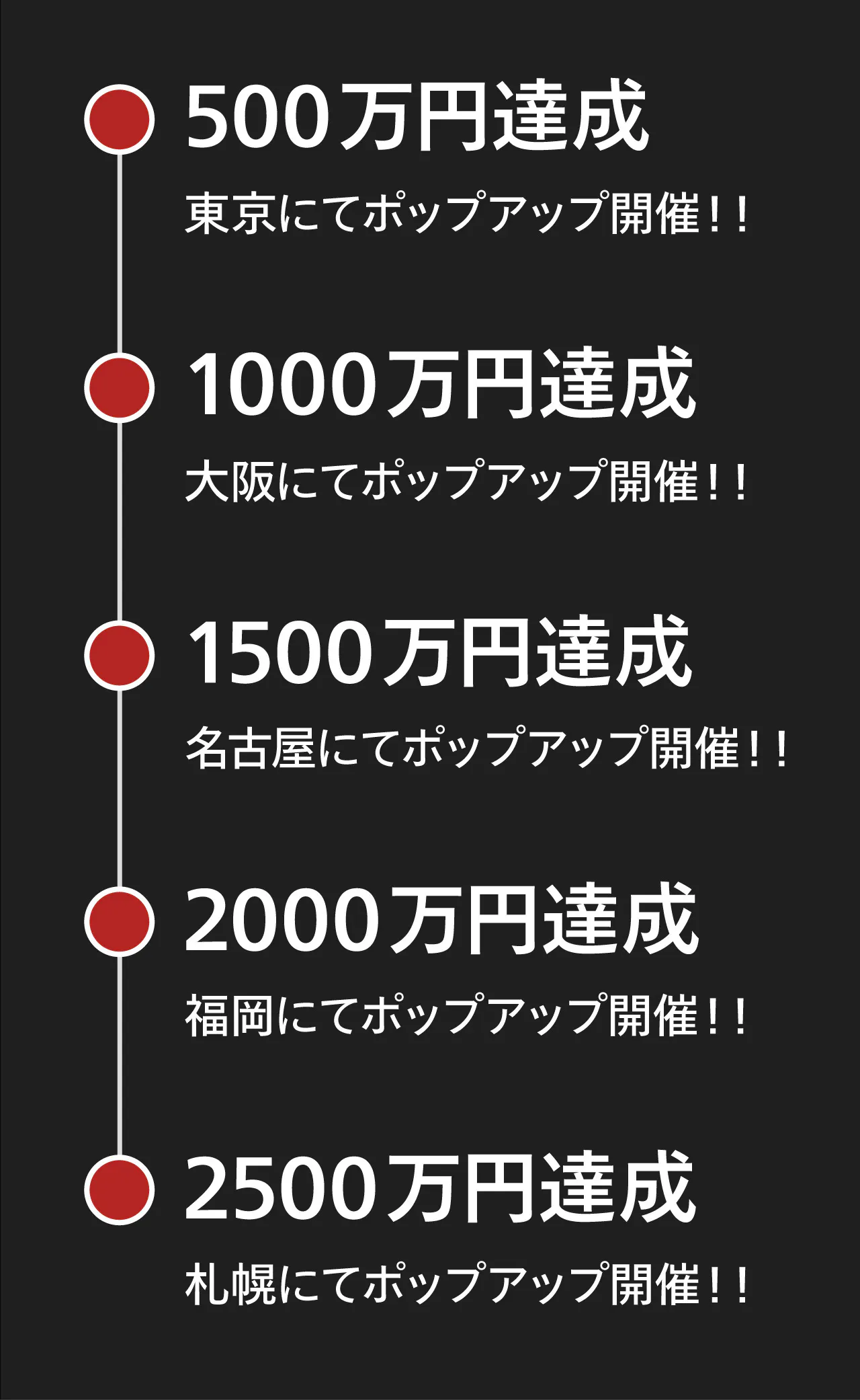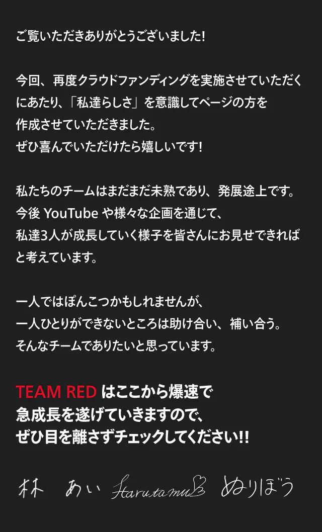 今回このクラウドファンディングを皆さんと一緒に盛り上げていきたいと思っているため、達成額に応じて下記を開催することをお約束いたします!東京以外の遠方にお住まいの方、私達3人が会いに行きます!!