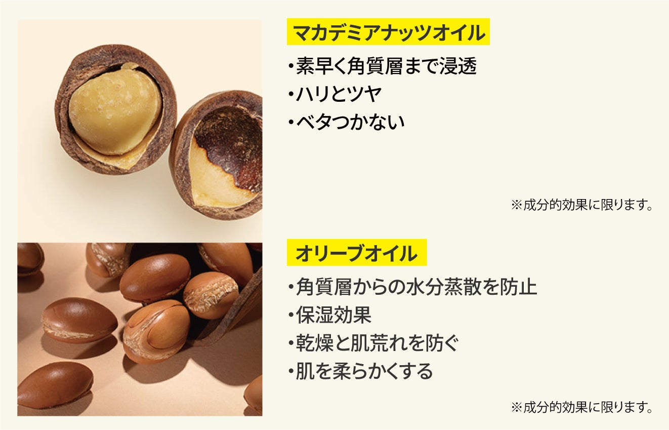 ①肌なじみ良い「人の皮脂に近い天然オイル(マカダミアナッツオイル+オリーブオイル)使用」