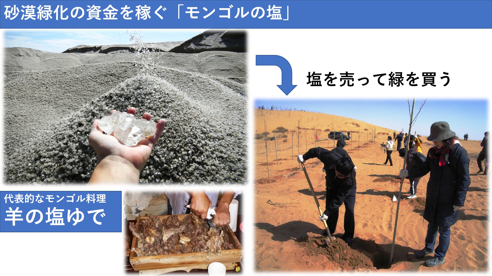 砂漠緑化に一番必要なのは資金、それを稼いでくれるのがモンゴルの塩です。モンゴル料理といえば羊ですが、味付けは塩だけ。塩だけで素材が美味しくなります。この塩はきっと売れるに違いない、そう思い2004年、塩を売って緑を買う会社バンベンを立ち上げました。