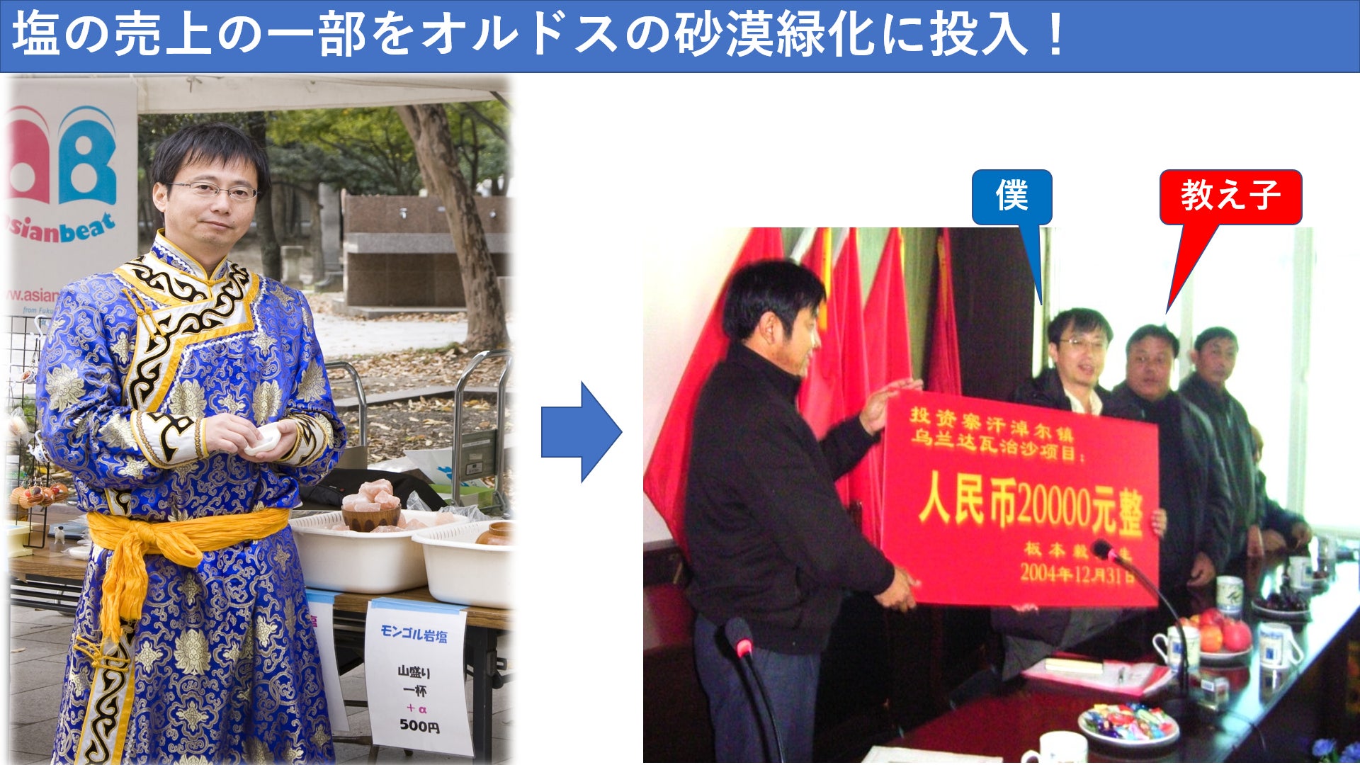 商材が塩なのでそれほど売上はありませんでしたが、亀のような歩みでゆっくり着実に進めていきました。少ない売上の中から毎年数十万円を、砂漠緑化に投入。
