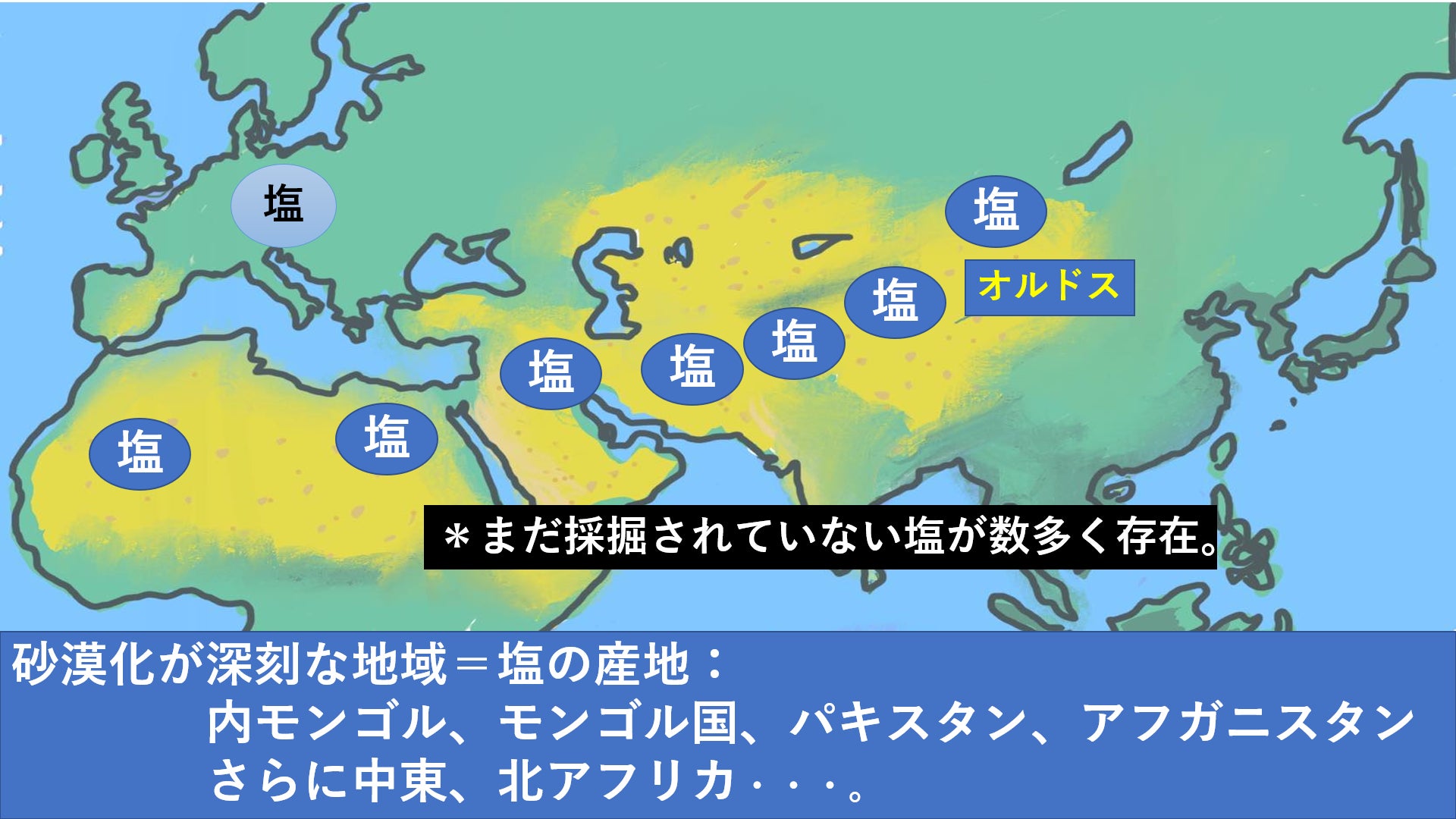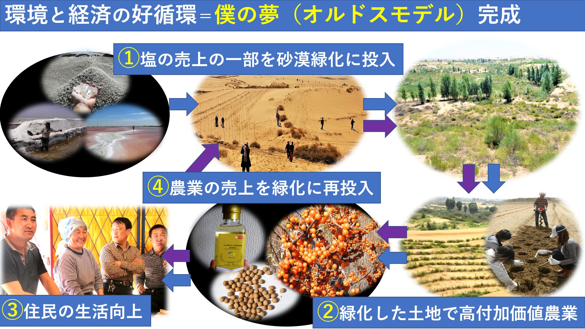 オルドスモデルが完成すれば、これら地域の砂漠に眠っている塩を採掘し、世界中で販売、売上の一部を砂漠緑化に投入。緑化した土地で高付加価値農業を実践。オルドスモデルを世界の砂漠化に苦しむ地域へフランチャイズ展開していきます。