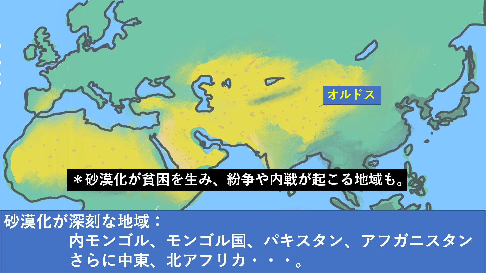 特に深刻な地域は、内モンゴル、モンゴル国、パキスタン、アフガニスタン、さらに中東や北アフリカまで。砂漠化が貧困を生み、紛争や内戦が起きている地域もあります。