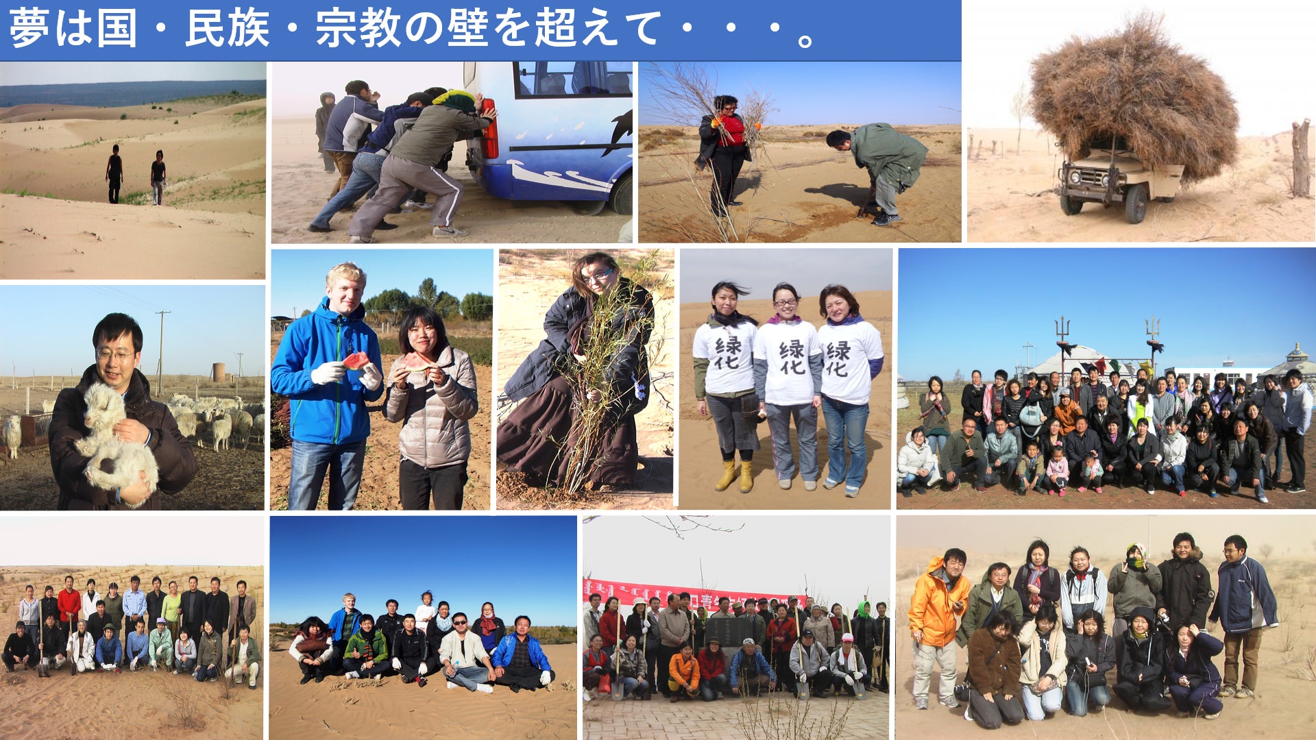 そしてこの「夢」は国や民族や宗教の壁も超えていきます。みんな同じ夢を持って、同じ方向を向いています。夢の共有が砂漠化を止め、貧困や紛争や内戦のない世界へ導きます。