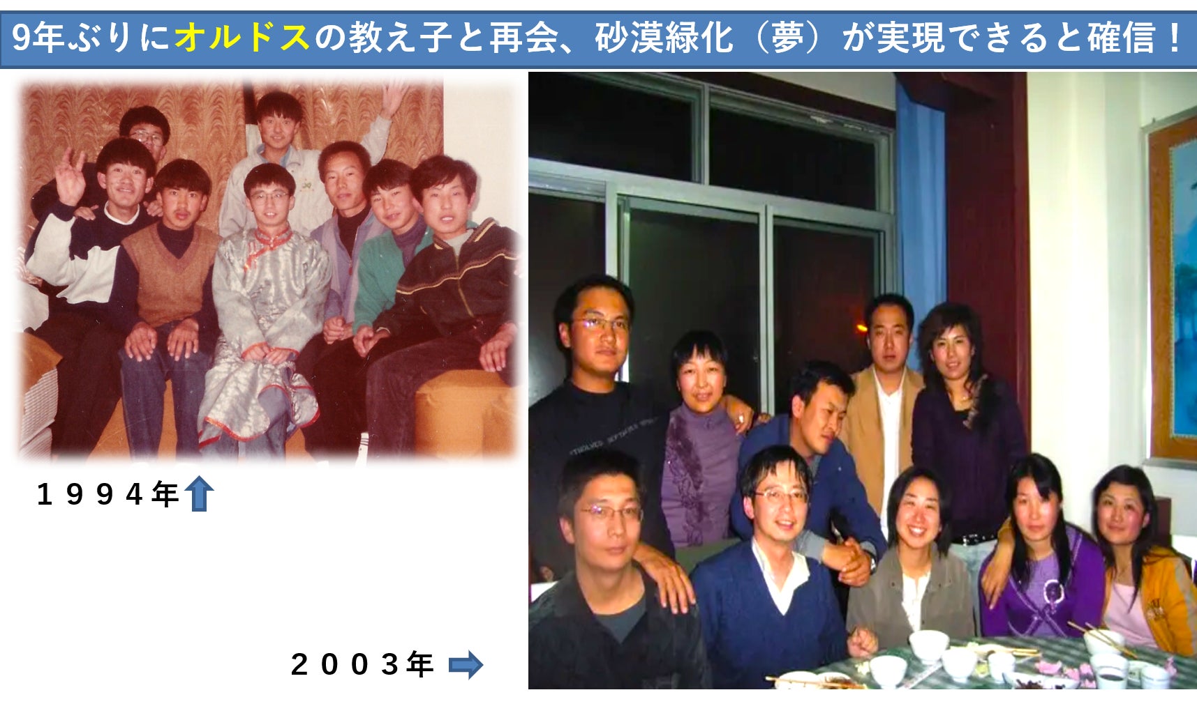 こうした経緯から、「第2のふるさとオルドスを、元の緑に戻したい」という思いが、強くなっていきました。しかし当時は行動を起こすことができないまま帰国、歳月だけが流れていきました。それから9年経った2003年、教え子から同窓会に誘われ久しぶりにオルドスへ。