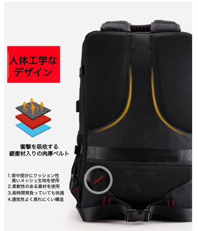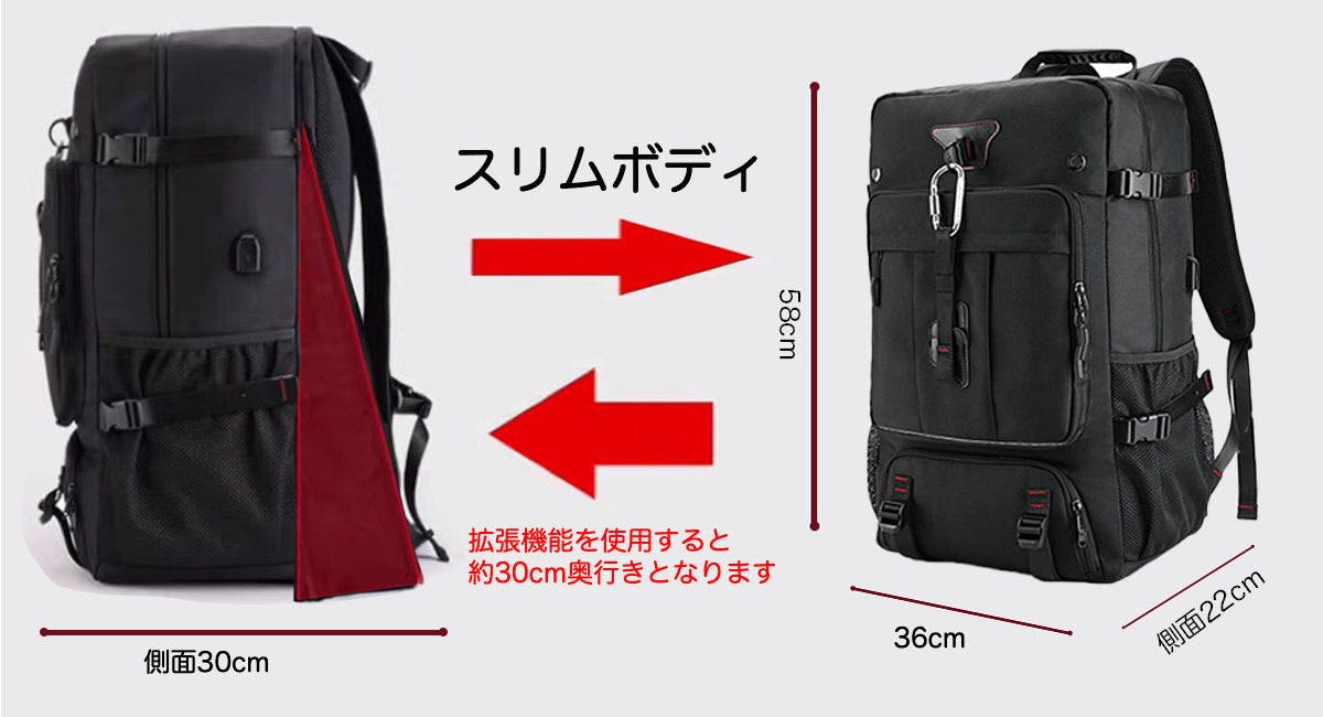 キャンプや登山、スキー道具、旅行であれば4~6泊分の荷物が軽々と入ります。多数ポケットがあり、独立した靴ポケットを設置し、空間分別収納実現、大人靴が一足分入ります。登山や旅行、運動時などに予備の靴を持ち歩くことで、便利です。