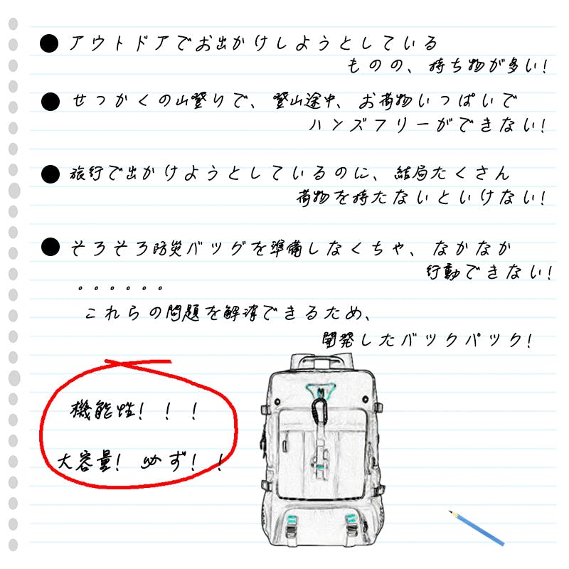 「もしもの時には防災バックに!「⼤容量・多機能」アウトドアバックパック!」