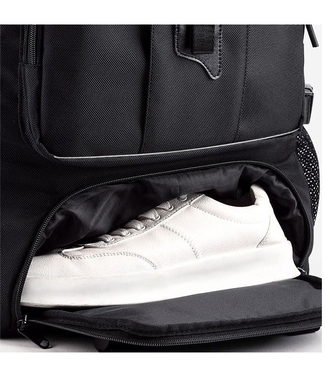 A:シューズが収納できるスペースになっています。メインコンパートメントと別空間なので、においや汚れがうつる心配 もありません。シューズに限らず、お着替えや汚れ物を入れるスペースとして使うなど、使い方は色々ございます。