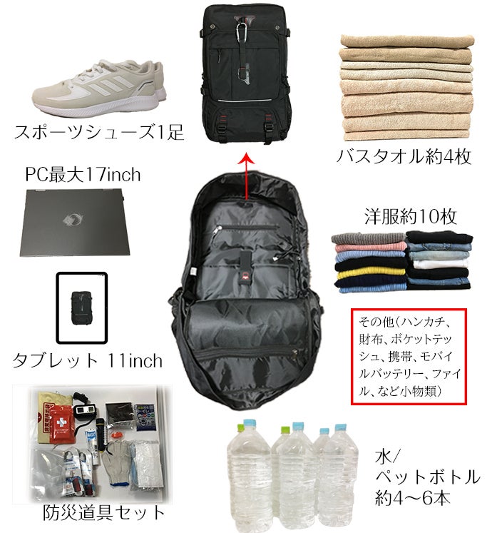 ★もしもの時には防災バックに!小物、貴重書類、着替、防災道具、靴までが入る多機能性バックパック!
