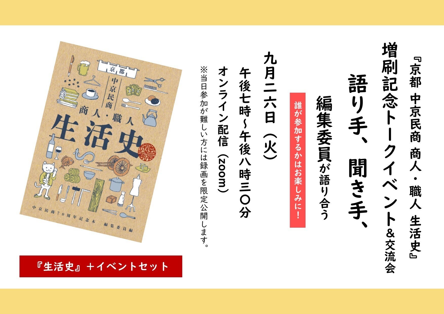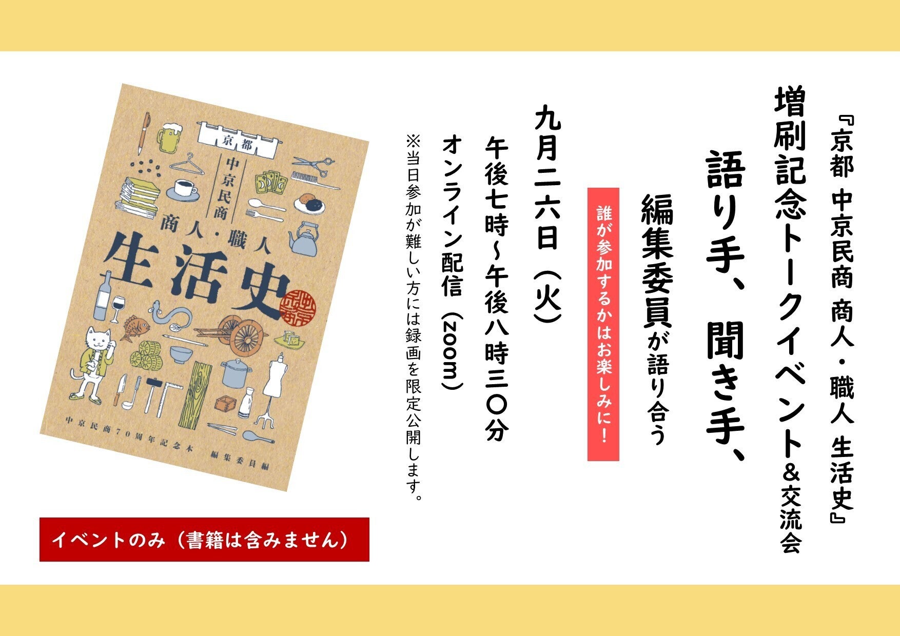2023/07/21 22:25リターンを追加しました!『京都 中京民商 商人・職人 生活史』の増刷を記念したオンライントークイベントです。そもそもどういう経緯でこの本づくりが始まったのか。語り手は自分の語りが本になったのをどう感じたのか。聞き手は語りを聞き文字に起こしていく過程で何を感じたのか。本づくりの経験のあるメンバーがいないなかで、どうやってこのような本の形にしていったのか。語り手、聞き手、編集委員が語り合います。 どの「語り手」が来るかはお楽しみに!9月26日(火)19時から20時30分。Zoomでオンライン配信します。その時間帯の視聴が難しい方には録画をお送りします。本をすでに購入して読まれた方にも強くお勧めしたいリターンです。イベント試聴のみは1,500円、本1冊とイベント試聴のセットで3,300円です。残り4日です。最後まで頑張りますので、拡散よろしくお願いします! もっと見る