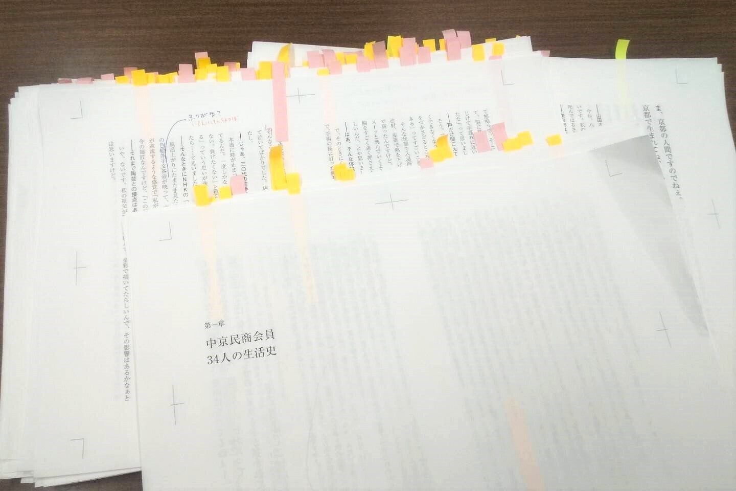 『京都 中京民商 商人・職人 生活史』の制作にあたっては、中京民商の会員から「聞き手」と「語り手」を募集し、事務局を含め9人の「聞き手」が、34人の「語り手」となった会員の生活史を聞き取りました。 聞き取った内容(録音)を、まずはそのまま文字起こしして、さらに1人あたり4,000字~5,000字程度に絞り込んで、本に収録しました(これはなかなか大変な作業でした)。「聞き手」が手を加えてきれいに整えるということはせず、基本的に語られたそのままを収録しています(固有名詞を伏せたり、括弧で言葉を補ったりした箇所はあります)。 34人のうち8人の語りの一部を、1回目のクラファンの際の「活動報告」ページで紹介しています。どんな感じなのか、ぜひ試し読みしてみて下さい。 続きが読みたくなった方は、ぜひ1冊購入して下さい。本(第2版)のお届けは8月中旬以降で、表紙の判子も印刷(第1版は1冊ずつ手押し)になってしまいますが、定価(2,200円)よりも少しお安く購入していただけるようになっています。