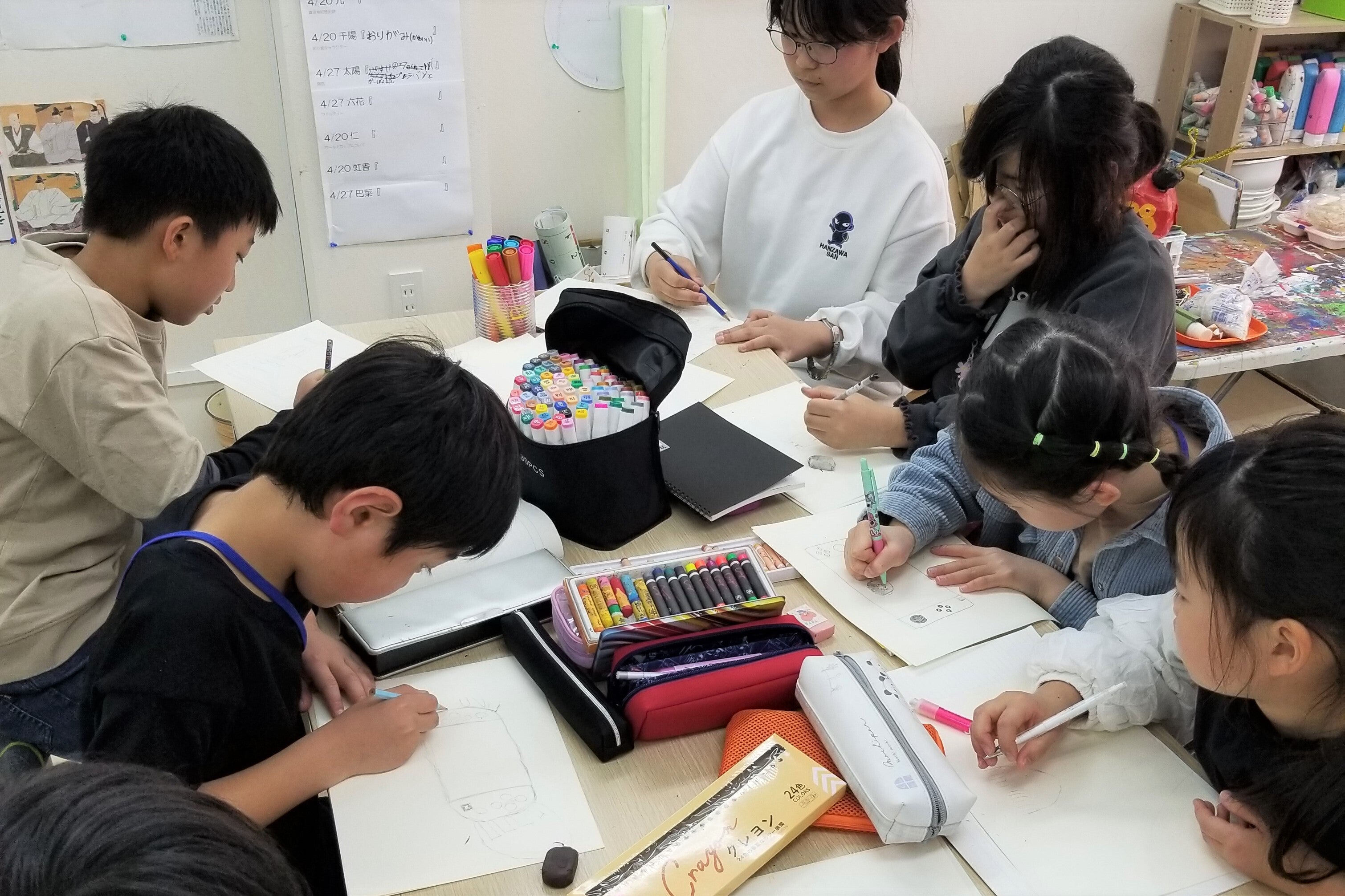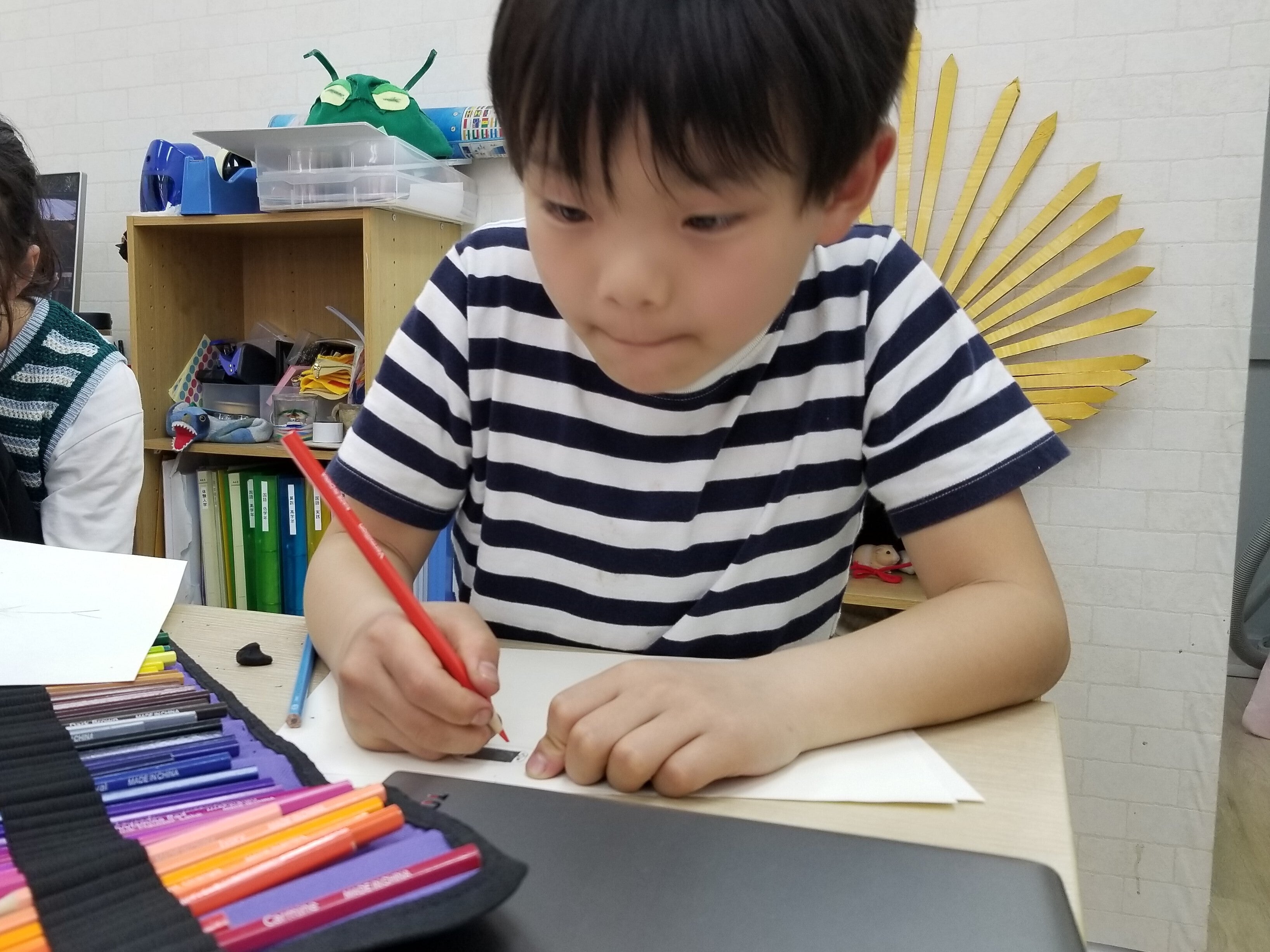 まず自分を知ってその周りの世界を取り込んで行き、どう自分を表現するか。なかなか難しいテーマですが、子どもたちすらすら~とペンを走らせ哲学的な世界観も生み出していました。