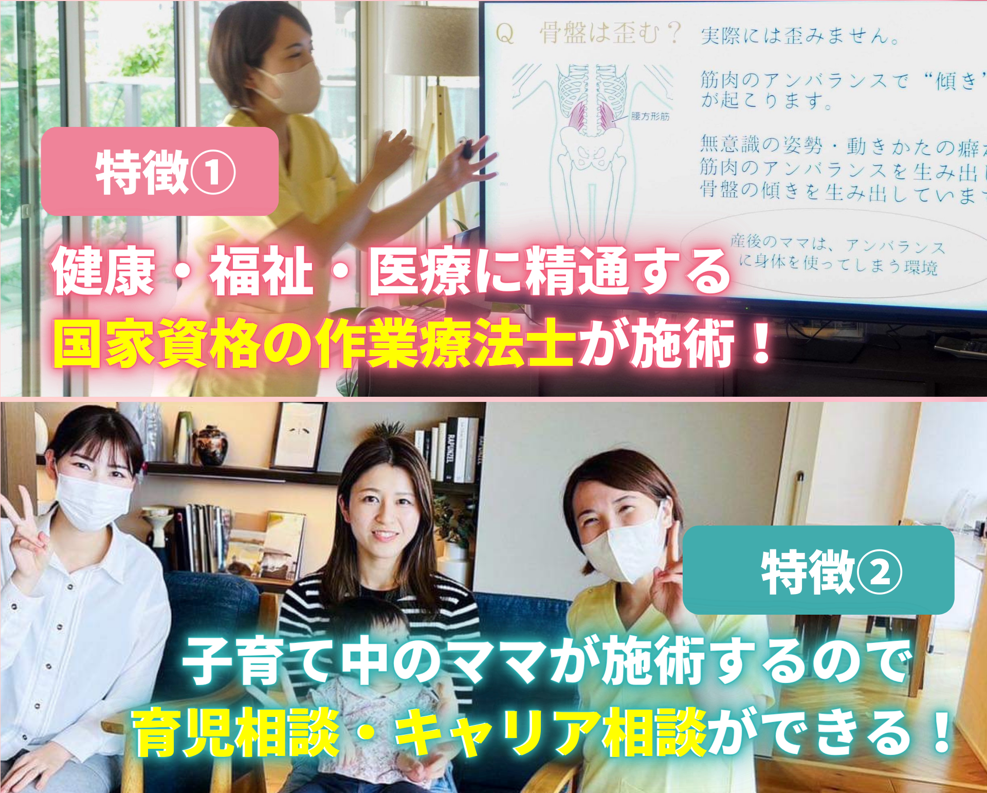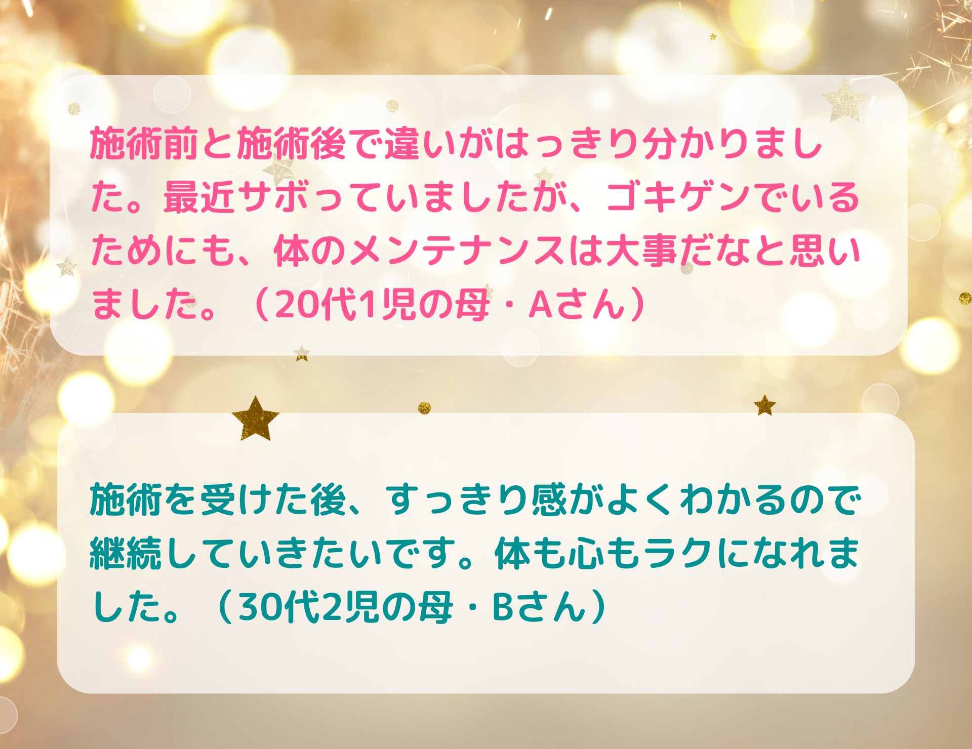 一度出張サービスを依頼することにしたのですが、普段の姿勢や授乳時の姿勢も見てもらい、その後施術してもらったところ、身体がスッキリ! 身体を整えてもらったことで、疲れにくくなったのはもちろんですが、 それ以上に、 同じ子育てママさんだったスタッフさんと会話ができ、心が本当に楽になりました。
