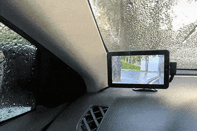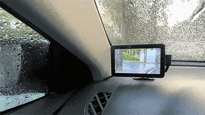 「JY-CMS 01」は、車内側にディスプレイ、車外側にレンズを取付けているので、雨が降っていても外の道路状況を画面ではっきりと確認でき、走行中の安全性を高めます。