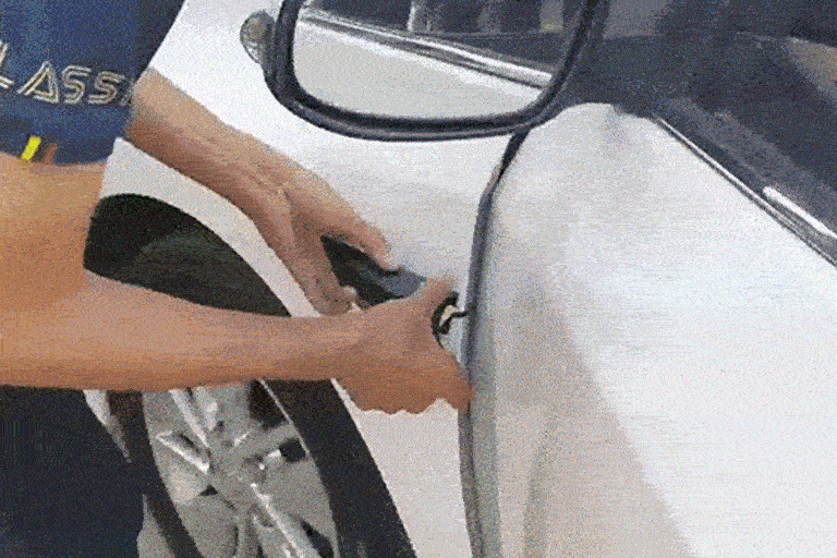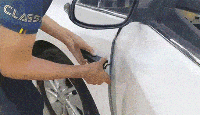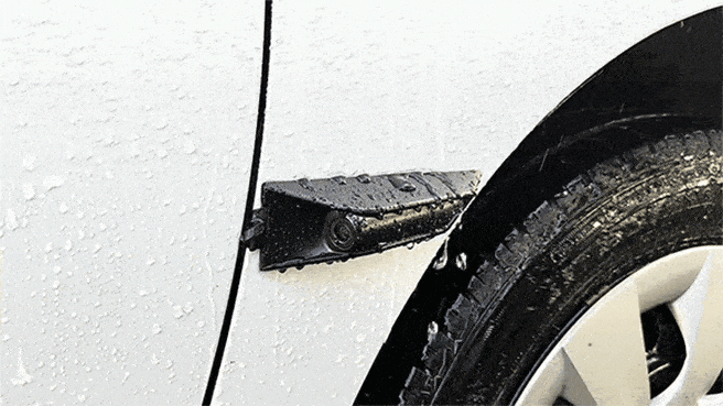 9.フェンダー面をウエスで清掃し、レンズケーブルをドアスリットから通し、カメラが地面と垂直に平らになる位置を探します。モデルによって異なりますが、高さは60cm~80cm程度で、レンズケーブルを差し込み、車を発進させて画面が正常かどうかを確認します。