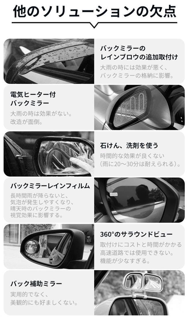 雨の日は補助ミラーの画像が滲んでしまい、周囲の道路状況を感覚的にしか判断できないので、安全運転に重大な影響を与え、雨の日の運転が怖くなることもあります。