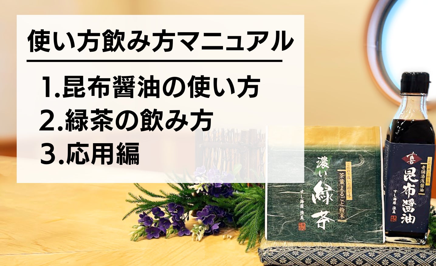 漁美-いさりびの昆布醤油と緑茶をご購入いただいた方に、安心してお使いいただけるように、使い方、飲み方マニュアルを動画でつくりました。
