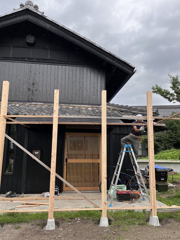 造園作業は垣根、蛇篭塀、そしてメインの園庭とやることがてんこ盛りなので雨の中でも休めません…。
