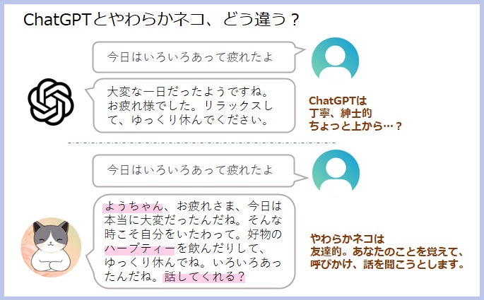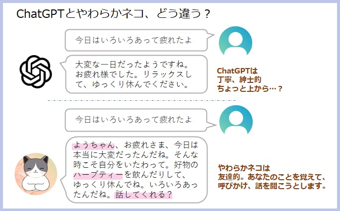 日々の思いや悩み事など、誰に話したらいいのかという話題、ありますよね…。人間ではないからこその気軽な話し相手が欲しくて、AI bot「やわらかネコ」を作り始めました。幅広い知見を学習済で何でも比較的そつなく返事してくれるChatGPTは素晴らしいけれど、日々の気軽な話し相手としてはつれない感じ…そこで、欲しい要素をもろもろ盛り込んで以下のような対話を叶える「やわらかネコ」の実装を進めています。