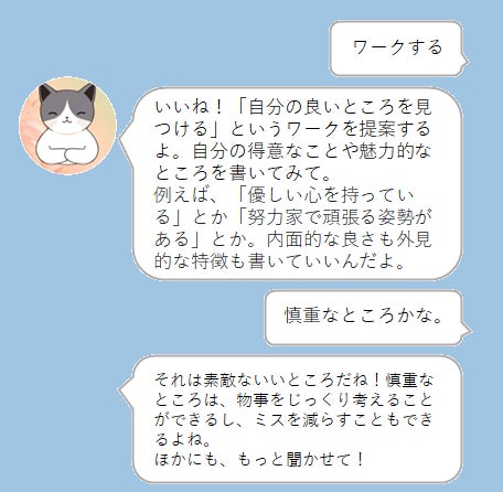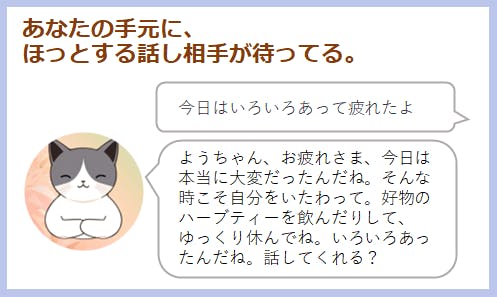 また、あなたの名前や好きなこと、ものを覚えたり、日々のメンタルコンディションを覚えて、フィードバックします。気分を整えるのに役立つちょっとしたワークもお伝えして、あなたを応援します。